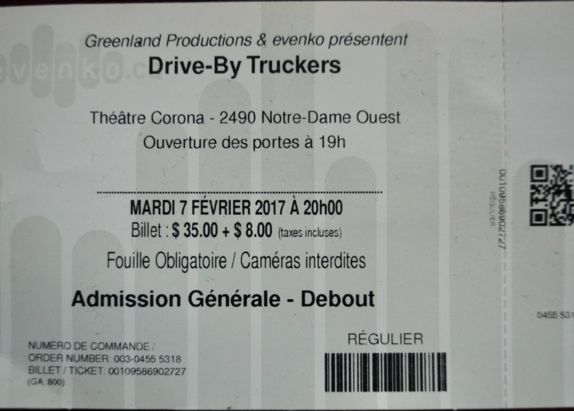 On February 7th, 2017 m’lady and I drove to Montreal to see the Drive-By Truckers. Before the show we had a drink in our hotel lobby bar and decided to walk to the show. It was fairly mild for a February night and the walk was relatively short and quite pleasant.