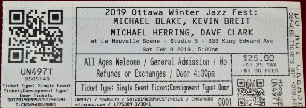 After a stellar show the night before (following a less-than-stellar show the night before that), on February 9th, 2019 I committed to see Kevin Breit’s third and final show at the Ottawa Jazz Festival’s brief winter fest. The last-minute decision to attend the show was augmented by my promise to Kevin the night before that I would scour the 600+ cd’s I retrieved from Ottawa taping-legend Bradm’s estate for some of the many recordings that Brad had made of Kevin’s parade of musical projects.
