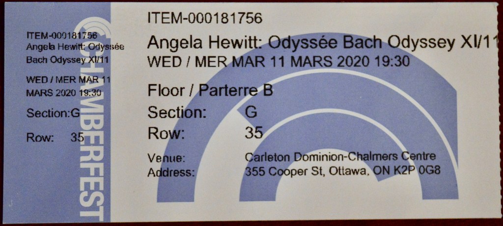 Anyway, this is all preamble so you would have an idea how fortunate I was to have witnessed Canada’s more recent Bach god(dess) Angela Hewitt performing an all-Bach program on solo piano at the Dominion-Chalmers Church on March 11th, 2020. Extra-fortunate I suppose, given that a) I won the tickets, marking the first (and thus far, only) thing I ever won after buying one of those children’s hospital $100 home lottery tickets for about fourteen years straight, and b) the concert just happened to fall on a date when I was going to be in Ottawa working the Blues In The Schools program.