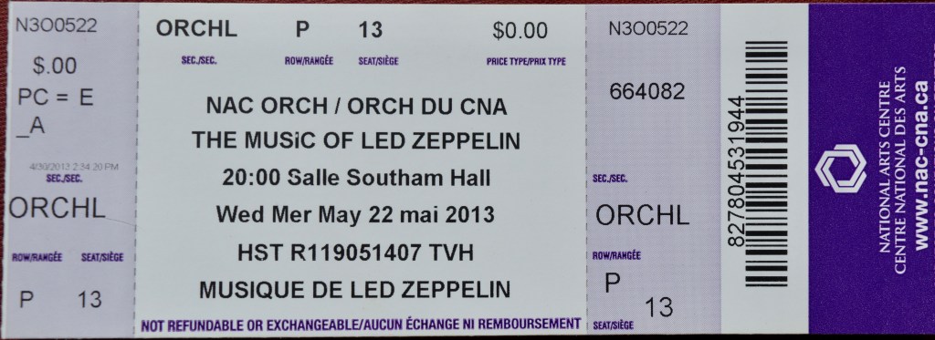 So on May 22nd, 2013 I was off to Ottawa’s National Arts Centre for an evening of Led Zeppelin music played by Canada’s national orchestra. But this was no Muzak version, the stage featured a rock band (drums/guitar/bass) fronted by an admirable vocalist; the NACO would serve as backup musicians.