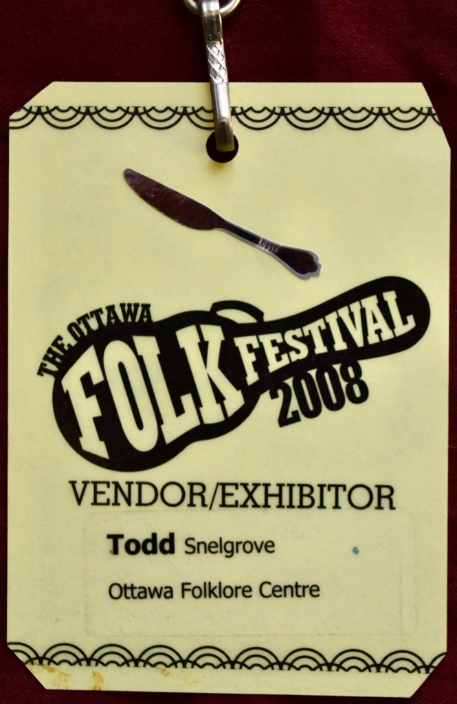 Piggy-backing that attitude onto the suppositions that emerge when gazing upon this lanyard and its reference to my workplace (the Ottawa Folklore Centre) for fifteen-odd years (some of them very odd), and one can only assume that I didn’t pay for this one either. Oh, the guilt I feel. I’m not sure I even gigged in return for this, though I very well may have done a set in the OFC CD tent.