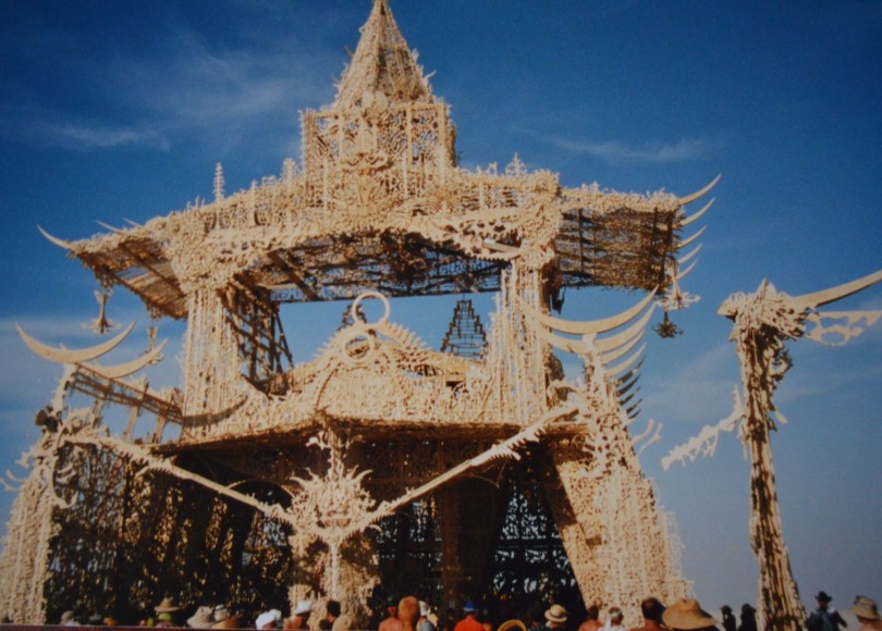 While The Man gets burned on the penultimate day, this was the day that the rest of the officially built Burning Man creations were burnt, things like the maze and the temple. I’m struggling to remember if I saw the temple burn but I’m pretty sure I did. It was an amazing structure that I had visited twice, and both times found myself surrounded by people in tears. The temple had been built of raw wood with countless asymmetrical holes cut into it, and the idea was for people to write the names of lost loved ones on a tiny scrap of wood and place that scrap somewhere inside. By the end of the week the giant temple was overflowing with messages of grief. It was beautiful, tragic, powerful, and truly, truly awesome.