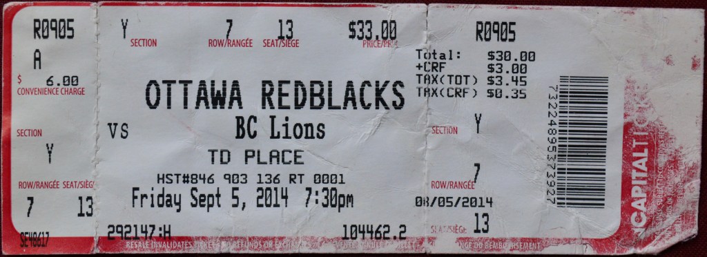 Unless I’m mis-remembering (which falls somewhere between “possible” and “likely”) it looks like September 5th, 2014 was the first time I attended a professional football match*. This was the year that the Ottawa CFL team came out of their second hiatus (after 120 years as the Rough Riders and five more as the Renegades) with a new name (the Redblacks) so yeah, this must have been my first time