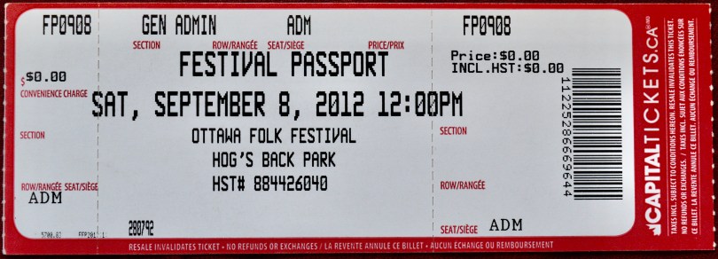 And that was it for the Folk Fest for me for 2012. I had played the sidestage the night before and saw Ben Harper do a great headlining slot but looking at the ticket stub I’m guessing I had been given a free full-festival pass. I’m not sure why I skipped out on the next two nights…I guess I just wasn’t very interested in the lineup. I know I was already double-booked for the closing night as I had tickets to see Madonna that evening. In retrospect I should have gone to Folk Fest after all.