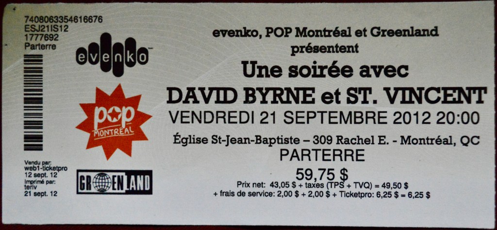 On September 21st, 2012 I drove to Montreal to see the wonderful David Byrne (of Talking Heads fame*). The bill advertised that he’d be performing with St. Vincent (of no fame whatsoever, as far as I knew when I bought the ticket) at the Église St-Jean-Baptiste Church in Montreal, which seemed appropriate.