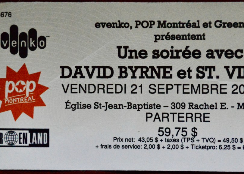 On September 21st, 2012 I drove to Montreal to see the wonderful David Byrne (of Talking Heads fame*). The bill advertised that he’d be performing with St. Vincent (of no fame whatsoever, as far as I knew when I bought the ticket) at the Église St-Jean-Baptiste Church in Montreal, which seemed appropriate.