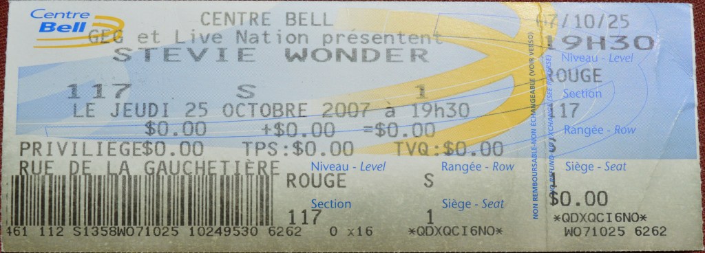 This was the only time a Stevie Wonder concert showed up on my radar; the first time we were ever geographically and chronologically synched, if a two-hour drive counts as synchronicity. I was shocked when I entered the Bell Centre and found ushers directing 300 level ticketholders like myself to better seats. It seems the show was dramatically undersold – I hope nobody told Stevie.