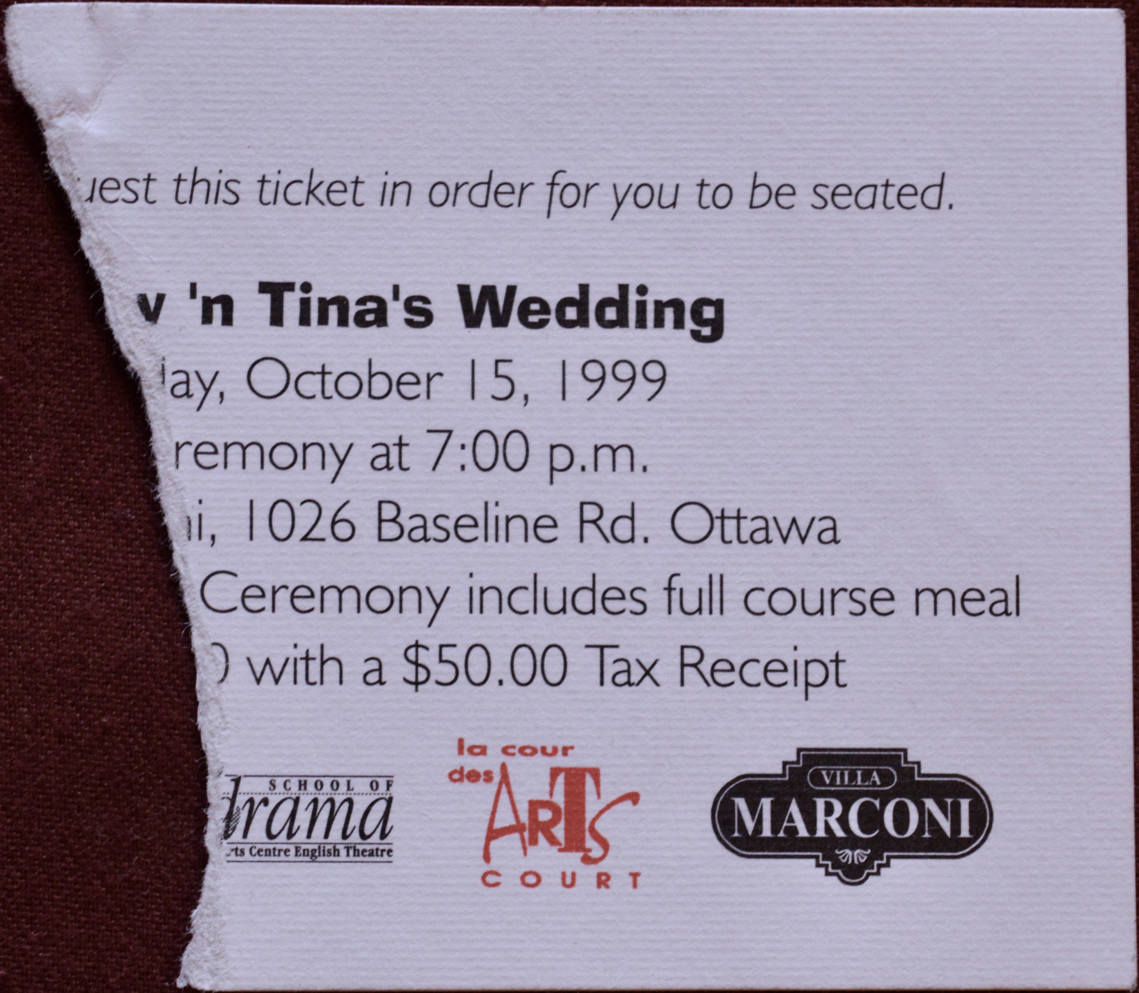 -Tony ’n Tina’s Wedding, a rather well-known 1990’s interactive phenomenon that took place not on a stage but in an actual restaurant – in this case at Ottawa’s Villa Marconi – and I believe might have been Eric’s one and only paid role, one that I took in on August 15th, 1999, with dinner