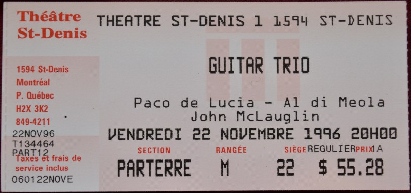 And that’s how the three of us ended up at the St. Denis Theatre on November 22nd, 1996 for a concert featuring John McLaughlin, Paco de Lucía, and Al Di Meola. We were about a third of the way back on the floor of the old movie house, with maybe four hundred guitar geeks in front of us and another seven or eight hundred guitar geeks behind, with several hundred more up in the balcony.