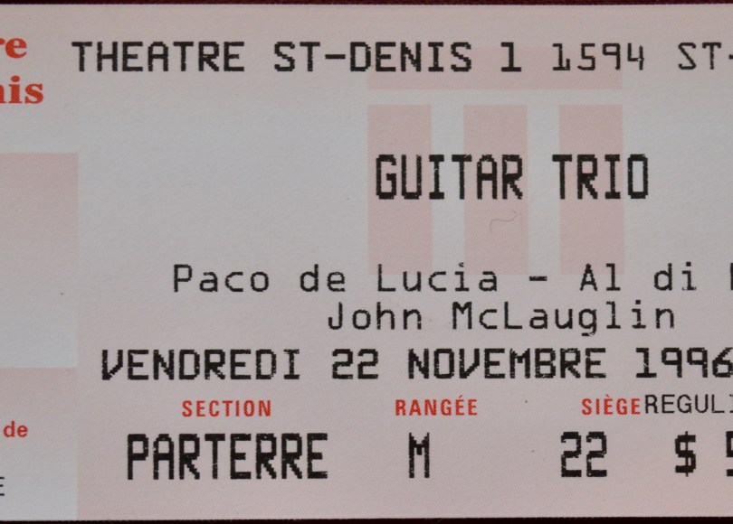 And that’s how the three of us ended up at the St. Denis Theatre on November 22nd, 1996 for a concert featuring John McLaughlin, Paco de Lucía, and Al Di Meola. We were about a third of the way back on the floor of the old movie house, with maybe four hundred guitar geeks in front of us and another seven or eight hundred guitar geeks behind, with several hundred more up in the balcony.