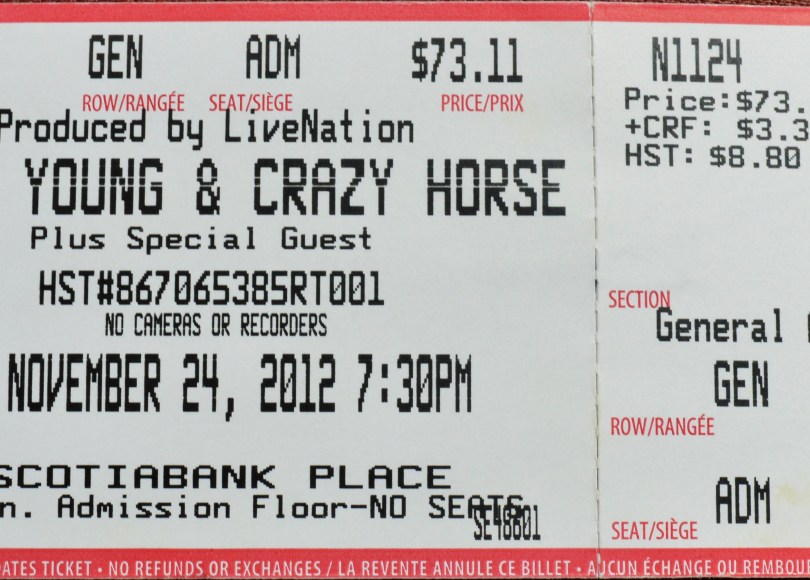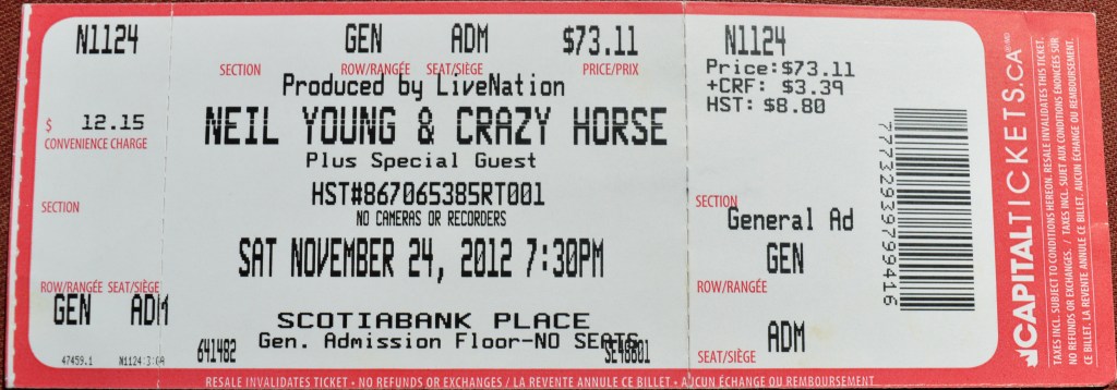 On November 24th, 2012 I was privileged to see the right honourable Neil Young and his raucous Crazy Horse, once again in the building I call The Palladium just beyond the outskirts of Ottawa. It’s sometimes hard to keep track of what the sponsors call the place year to year, but I’m sure I’ve seen Neil at Scotiabank Place, The Corel Centre and possibly even The Canadian Tire Centre, though each of those shows occurred at this very same address: 1 Cornfield Row, Kanata.
