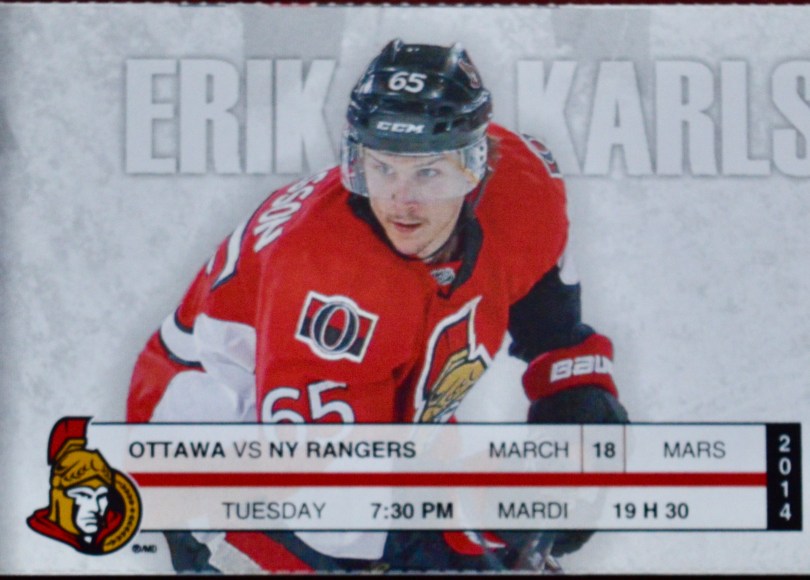 (I’ve got to add that looking at the stub today made me wonder why the ticket had Karlsson’s name writ large yet sported a picture of a young Daniel Alfredsson. It took a few double-takes for me to realize that the athlete pictured was in fact a young, short-haired Karlsson after all.)