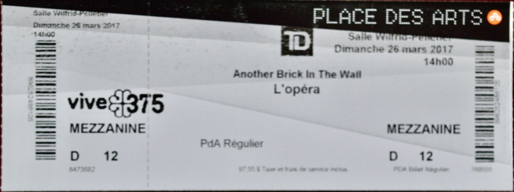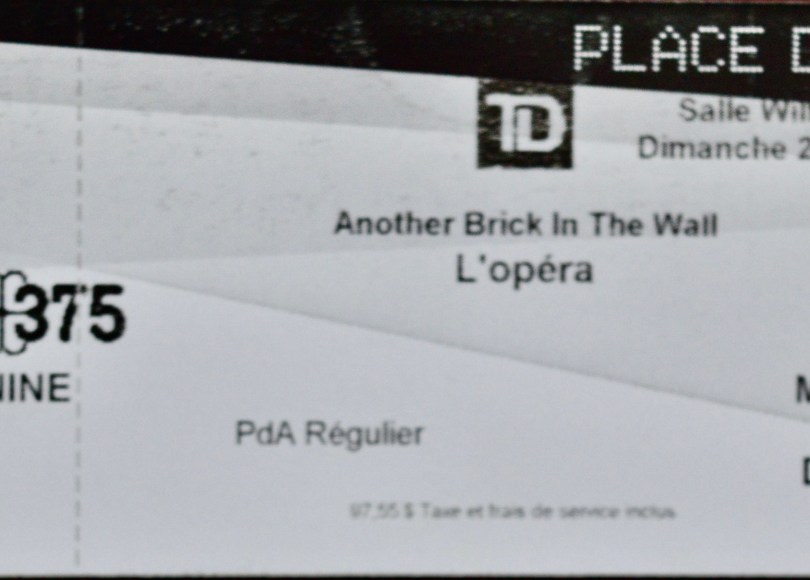 A little background: I had heard long before that a The Wall opera was in the works, slated to make it’s debut run in Montreal. When the official opening date was announced I was very pleased to see that the shows would be conducted by Alain Trudel, a conductor I’ve worked with for years through our association with the National Arts Centre Orchestra. I asked Alain about the show at a rehearsal and he positively gushed. The excitement he had for the project was palpable. He told me that it wasn’t an operatic version of The Wall, rather it was an opera based on the story behind one of the greatest rock operas ever recorded. The story was great, he said, the soloists were fantastic, the music and the libretto were all new and out-of-this world. Simply put he couldn’t wait for opening night, and I couldn’t wait for closing night (the night I had tickets for…or so we thought).