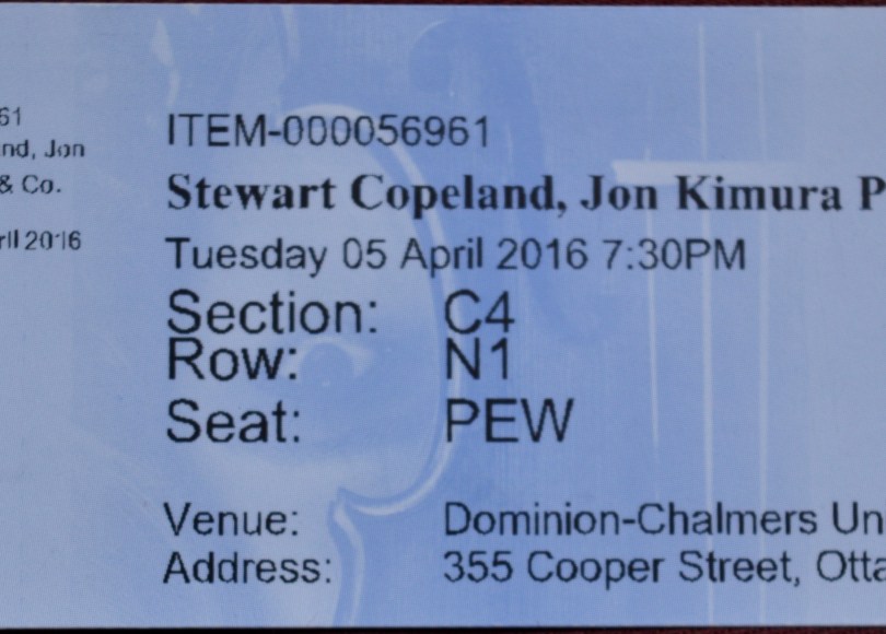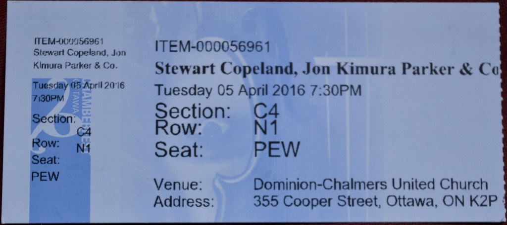 I was so excited to see Stewart Copeland play at the Dominion Chalmers Church on April 5th, 2016 that I bought a ticket despite knowing I’d be in Vermont that week snowboarding from a timeshare in Stowe. The concert was presented by the Ottawa Chamber Music Festival and it was to feature one of my favourite rock drummers alongside a host of modern contemporary players so I figured it would be well worth the midweek drive back home to Ottawa.