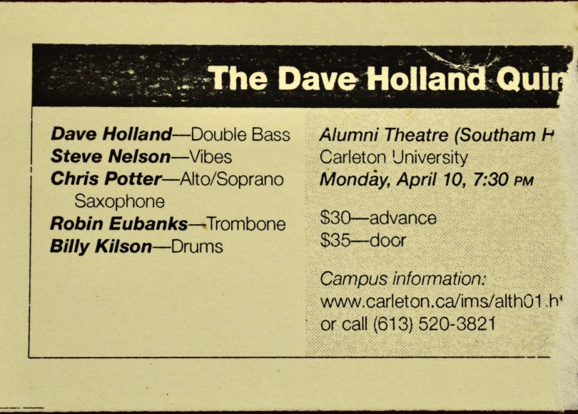 On April 10th, 2000 my good friend Wayne brought the Dave Holland Quintet to the Alumni Theatre at Carleton University*. Of course Dave Holland made a name for himself playing bass with Miles Davis (that’s him on Bitches Brew) before going on to record and tour with a who’s who of jazz history, like Thelonius Monk, Stan Getz, and others. Matter of fact, before this show I think I had only seen Holland once before, and that was as a sideman for Herbie Hancock.
