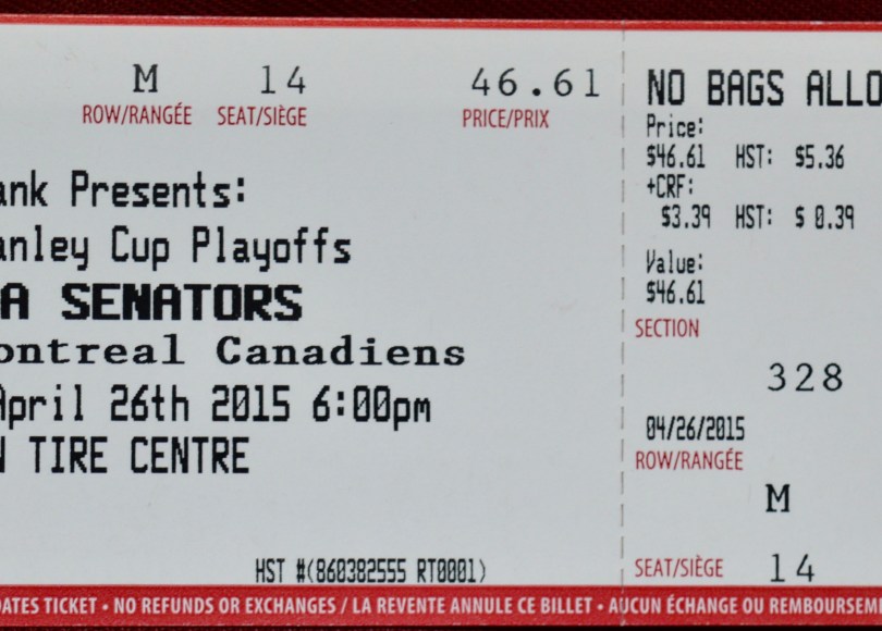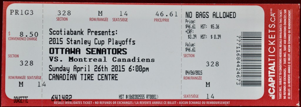And so it was on April 26th, 2015 that I attended game 6 of the opening series of the Stanley Cup playoffs, a powerful local rivalry between my beloved Ottawa Senators and the evil Habitants, the Montreal Canadiens. The crowd was a sea of two shades of red, as half the crowd donned hometown jerseys while the other half were proudly defiant in their darker, blood-red Habs jerseys. Luckily we’re all Canadians* (note: not necessarily Canadiens) so we’re friendly enough with the whole rivalry thing, even (especially) once the $12 beers start flowing.