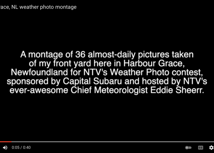 Newfoundland’s fantastic regional television station NTV regularly presents a Weather Photo Contest hosted by their equally-awesome Chief Meteorologist Eddie Sheerr. The prize is a new car and you can enter every day during the contest period so from early March to mid-April 2022 I took a picture looking out my dining room window every morning around 7am. I thought a montage of the thirty-six photos might be interesting and if you click the video above you’ll find out if I was right.