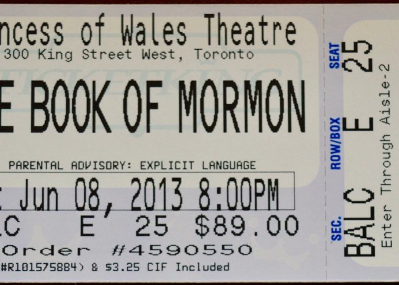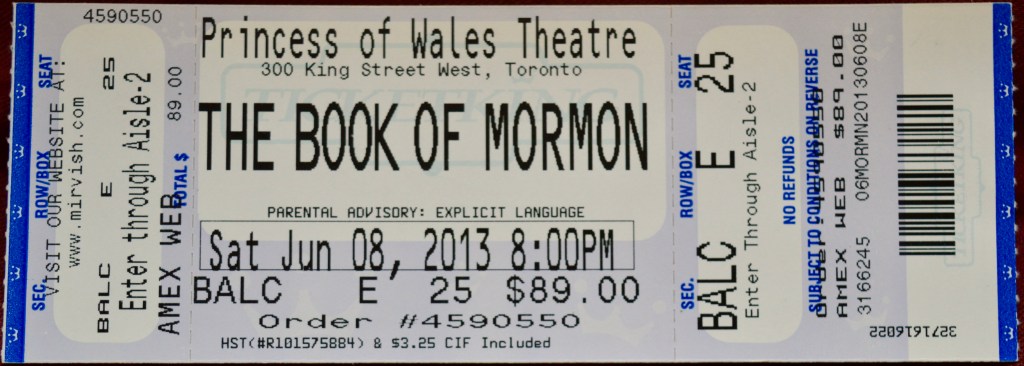 On June 6th, 2013 I went to see Book Of Mormon in Toronto. The Parker/Stone production was a huge hit on Broadway and while I’ve never been much of a fan of musicals I was intrigued. M’lady and I were in the Big Smoke seeing the Stones so we pulled the trigger and bought the cheapest tickets available.