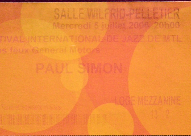 On July 5th, 2006 m’lady and I drove to Montreal to see Paul Simon. Our friend Jojo came along as well, though I’m pretty sure he didn’t have a ticket to the concert nor was he looking for one. But no matter, it was jazzfest week so there would be plenty to see and do in all directions surrounding the Salle Wilfred-Pelletier theatre, a complex aptly titled Place des Arts.