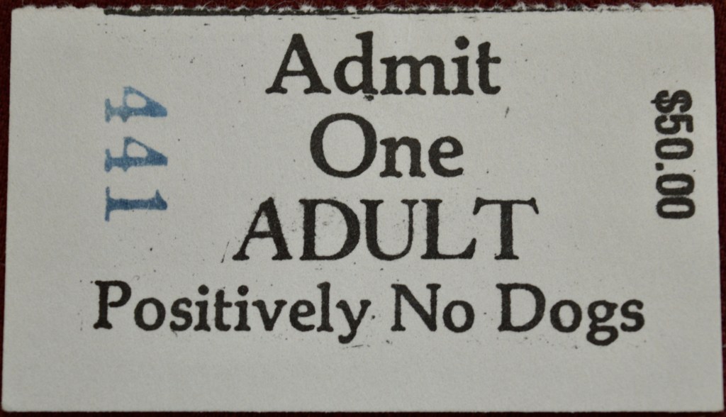 I see there’s not much left of the ticket stub from my third Blue Skies festival aside from the price ($50 per adult for a whole weekend of camping and music. Not too bad…), the ticket number (it’s hard to imagine there were many more than 441 tents set up for the weekend, with maybe triple that number onsite for the weekend), and (of course) the sole yet stern rule of Blue Skies: Positively No Dogs.