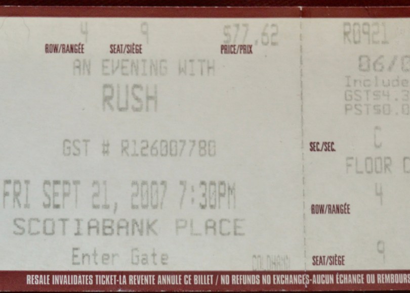 (I would be remiss if I let this ticket memory go by without mentioning the Whitey incident. A large, long-haired albino Ottawa music-fan legend, Whitey is best known for two things: his air-guitar skills and his love of Rush. And sometime late in the set Alex Lifeson spotted Ottawa’s great white bear wailing away in all his glory midway up the stands directly beside the stage.
