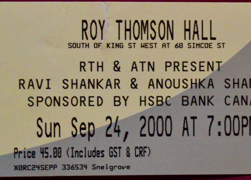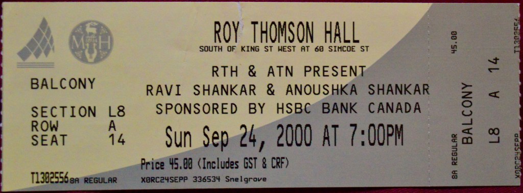 September 24th, 2000 marks the first time I saw the great Ravi Shankar (1920-2012). I saw this as a rare chance to attend a performance by the sitar master, a man who has been known to sell tickets a full three years before the show date, and a man revered by one of the world’s most populous nations (and Beatlemaniacs alike), many of which would be quick to snap up any and all available tickets when a Ravi show came to town.
