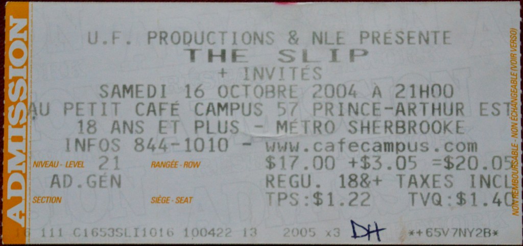 Anyway, I won’t get directly to the show in question because I really can’t recall much about it at all, aside from a moving snapshot in my mind of watching the band from the back half of the bar through obstructed sightlines. Funny, I figured that I’d been to Cafe Campus several times but I just checked and it looks like this was my only time seeing a band there (other than a possible nero show or two, but I recall most of their Montreal plays happening at Le Swimming) so yeah, the band I can almost see in my mind-photo is nearly certainly The Slip.