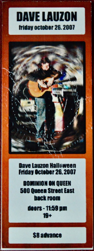 I was definitely more stagger than swagger when I transitioned from the frying pan to the fire during the waning moments of October 26th, 2007. It’s hard to imagine a scenario in which someone would be reading these entries in sequence but if they were they’d know that I had just emerged from a Ween concert at The Docks in Toronto, a show where liberally-poured alcohol and intense live rock and roll had worked me up to a frothy bliss. What my dear reader would not know is that I still had another ticketed and licensed performance to wallow in. Specifically: some dude named Dave Lauzon playing at a some place called Dominion On Queen. I can’t recall where the bar was located.