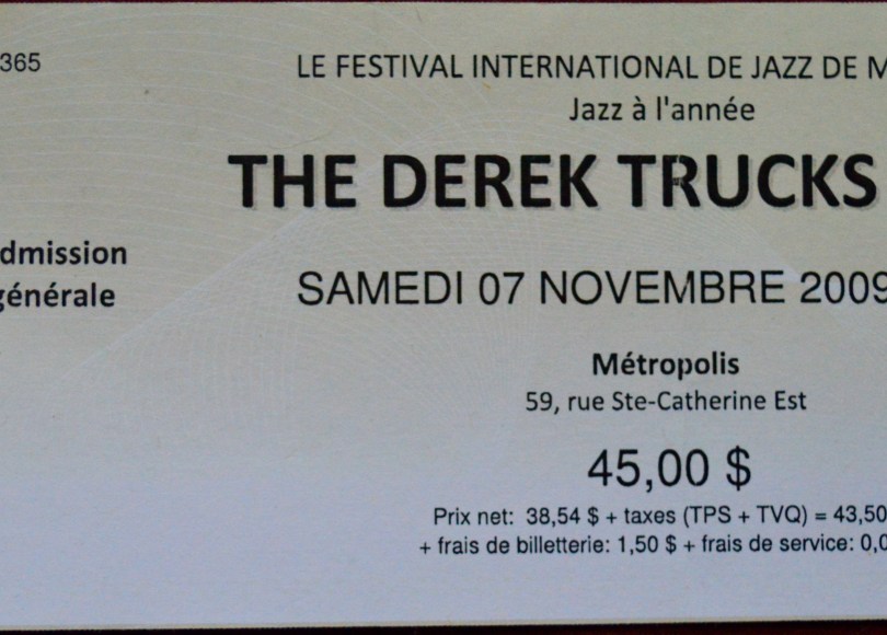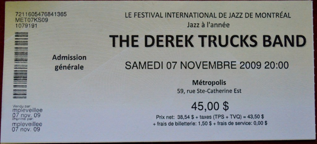 On November 7th, 2009 I drove to Montreal with m’lady and our good friend BradM to see the Derek Trucks Band at Metropolis (with an opening act by local blues duo Dawn Tyler Watson et Paul Deslauriers). I’m listening to the show right now on archive.org and it sounds great. Of course it does.