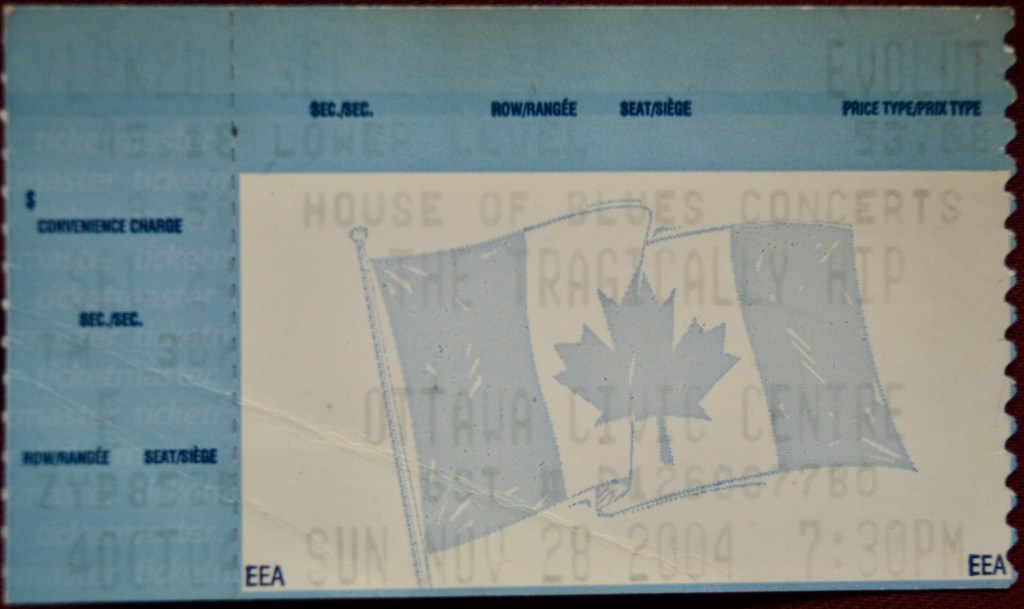 On November 28th, 2004 I took in a The Tragically Hip show at Ottawa’s Civic Centre. The band had just played the Grey Cup halftime show upstairs at Frank Clair Stadium a few days before (you can be forgiven if you don’t remember; Grey Cup halftime shows are to Superbowl halftime shows as snowbirds are to bald eagles, as Flin Flon is to New York City, as Pablum is to the Baconator, as Anne Murray is to Pantera; oh, I could go on and on) and were touring their very forgettable In Between Evolution album.