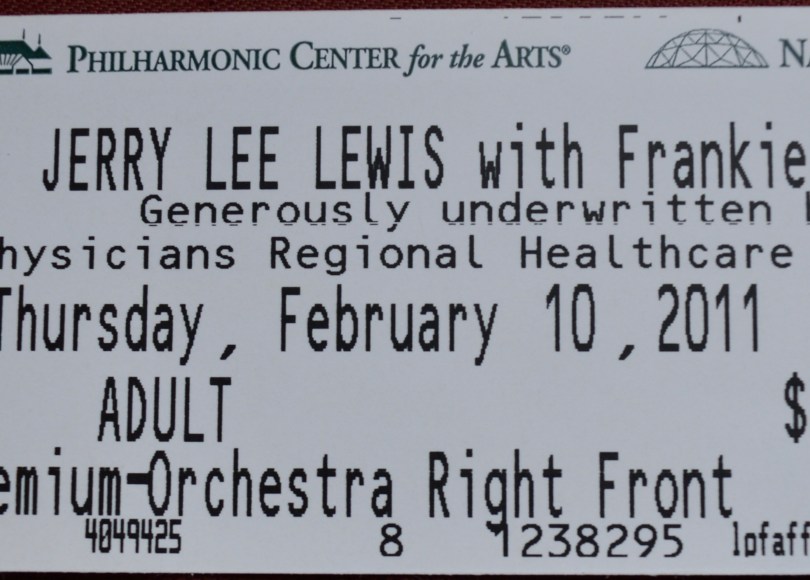 For some time I had planned February 10th, 2011 as the official end of the Rock & Roll Field Trip. After a pilgrimage that saw m’lady and I visit the homes of Son House and Mississippi John Hurt, the graves of Duane Allman and Elizabeth Reed and all three tombstones attributed to Robert Johnson, at least three Music Hall’s of Fame, both the house where Elvis was born and the one where he died, Nashville, Memphis, Muscle Shoals, the Allman Brother’s Big House, Sun Records, Fame Studio, and even the bus station in Macon, Georgia where Little Richard came up with the lyrics to Tutti Frutti…well, there really could be no better way to end a trip like that than a concert featuring the great Jerry Lee Lewis (1935-2022).