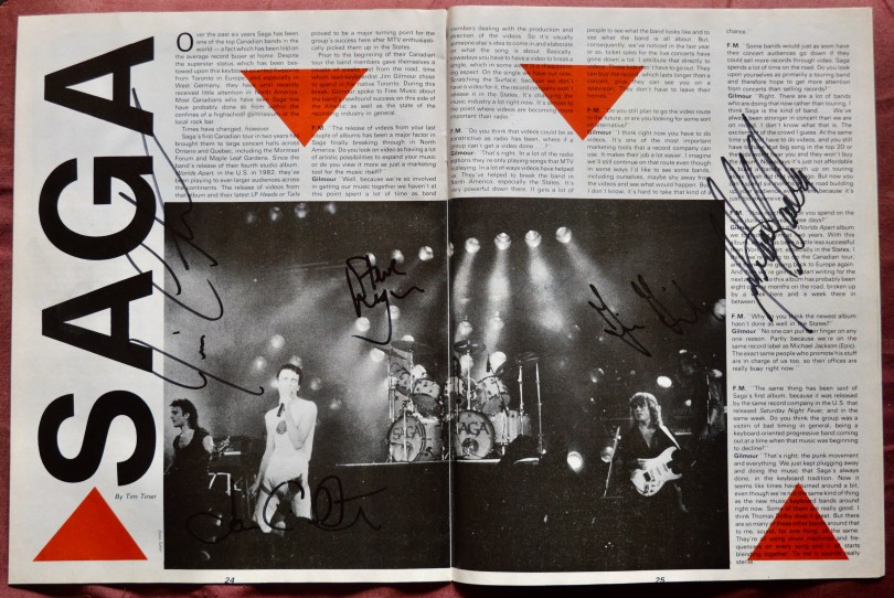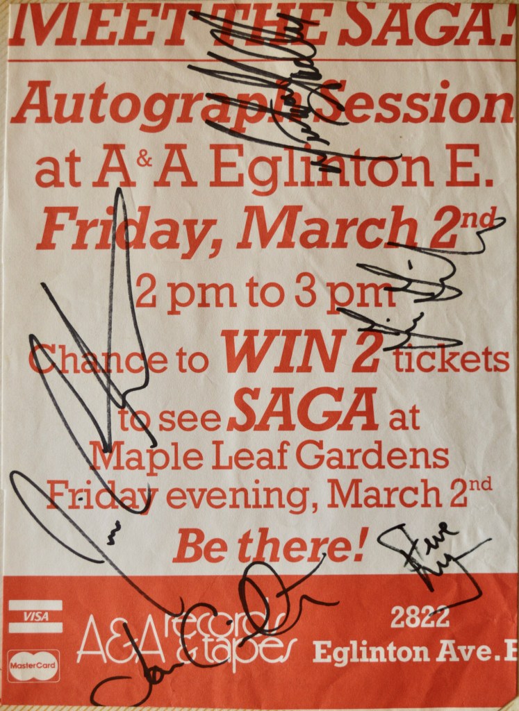 The 8 1/2″x 11″ “poster” at left pretty much says it all: Canadian prog-pop rockers Saga made a promotional appearance at A&A records on the afternoon before their concert at Toronto’s legendary Maple Leaf Gardens on March 2nd. Well, it doesn’t say the year, which was 1984. I saw something about it in the paper that morning and with nothing else to do, I went. I was a pretty big fan of the band but unfortunately I didn’t win the tickets they were giving away and I was definitely much, much too poor to afford to buy one, which probably would have cost about $12, so I didn’t go.