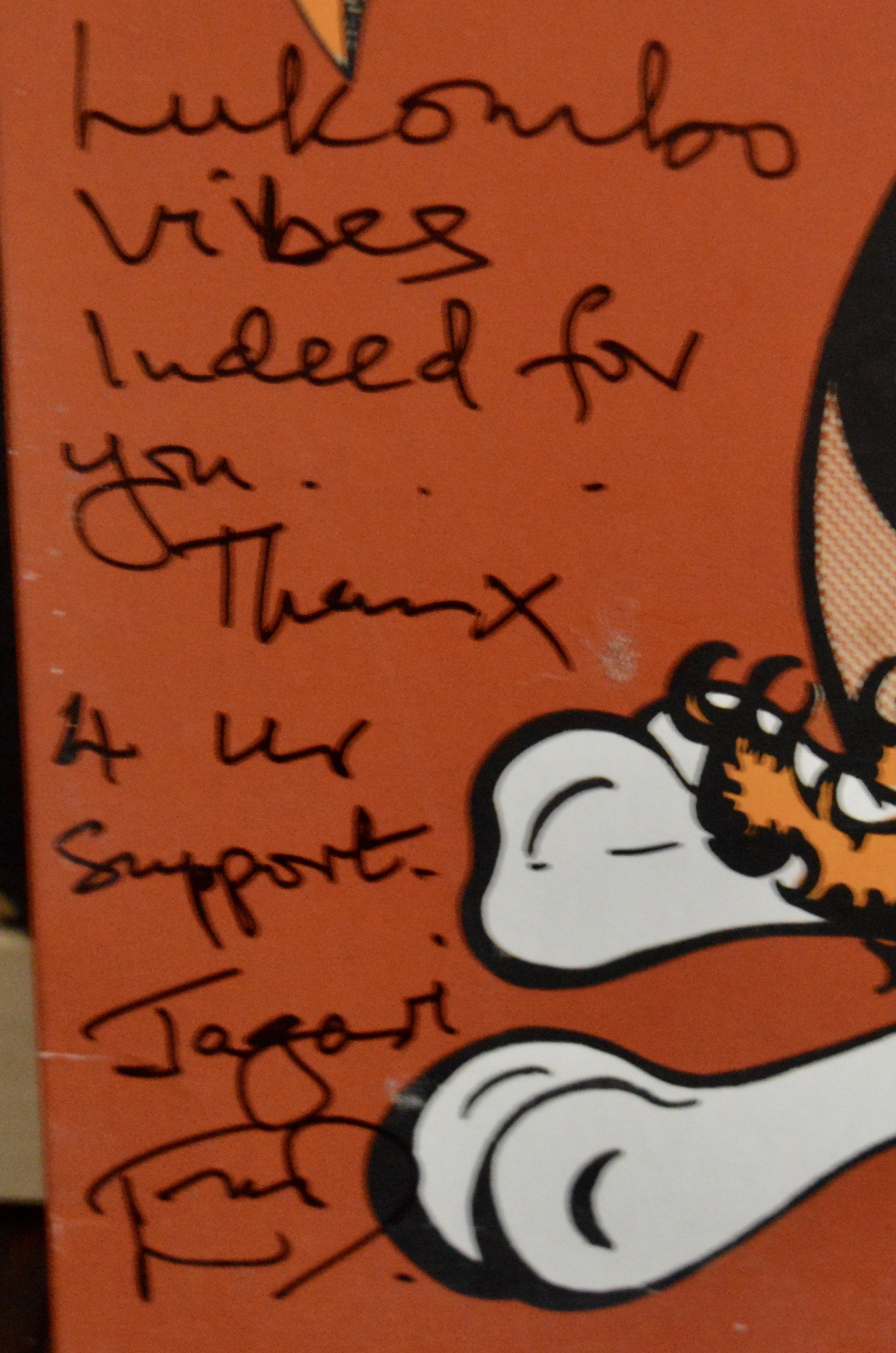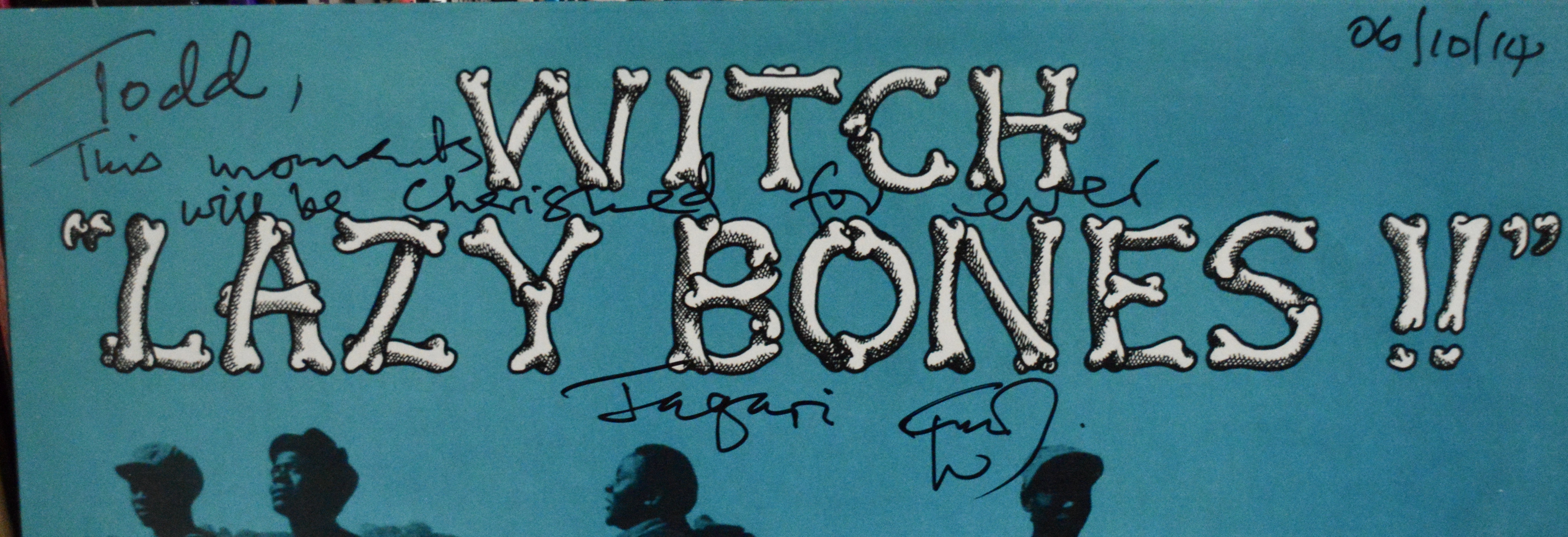 Though the band never gained the international recognition they may have deserved, WITCH was the defining group on the south-central African Zamrock genre of the early 1980’s. Lead vocalist Jagari Chanda is the only surviving member of the band and I had the pleasure of jamming with him a few times in Lusaka. The first time I visited his house I asked him to sign this rather rare LP copy of the complete WITCH box set, and he went on to intricately and extensively sign every single piece in the collection. Which was thoughtful. Wholly unnecessary, but thoughtful.