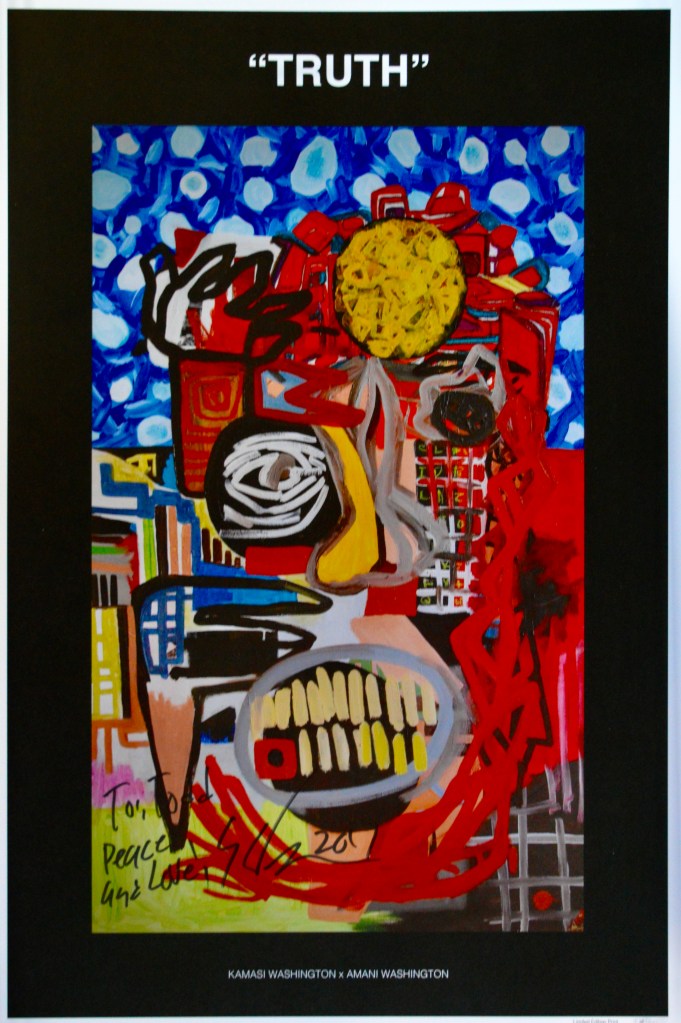I met saxophone phenom and bandleader Kamasi Washington at a meet-and-greet before his pair of concerts at Toronto’s Danforth Theatre on November 16th, 2017 (which you can read about here). The “goodie bag” that came with the VIP package included a really great t-shirt and this print of a painting Kamasi created for his song Truth, which he signed for me.