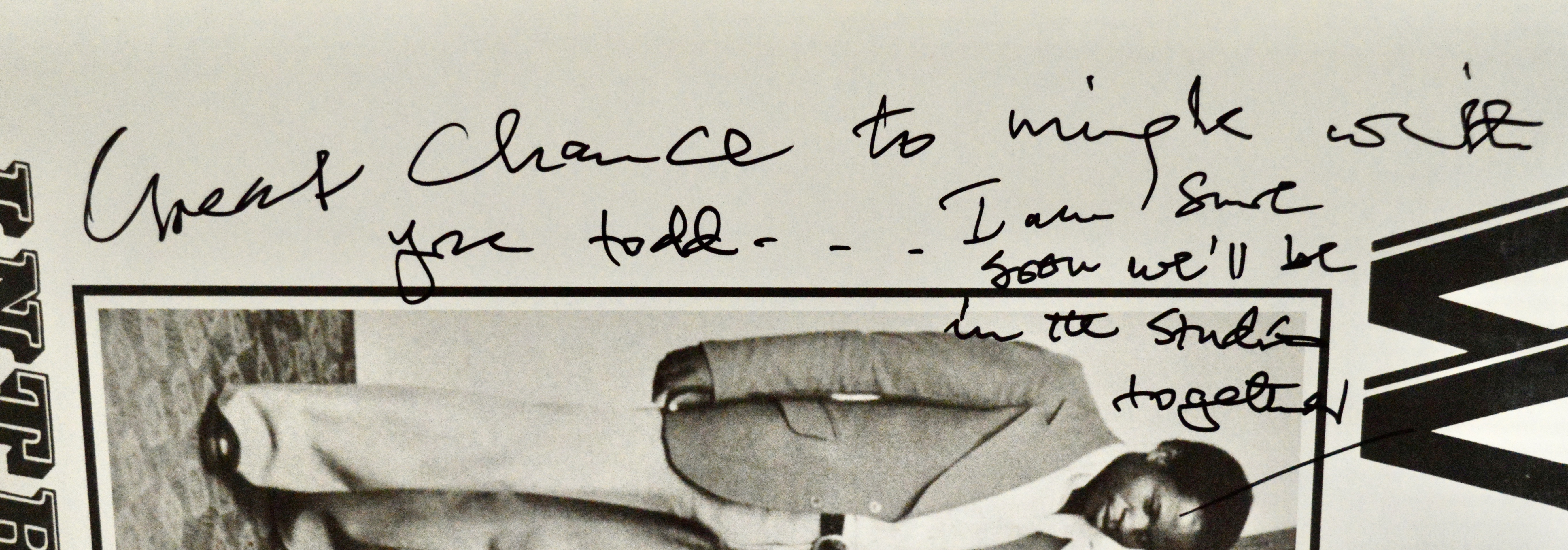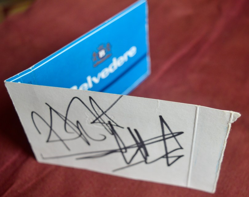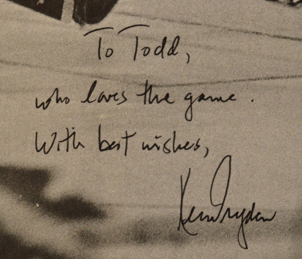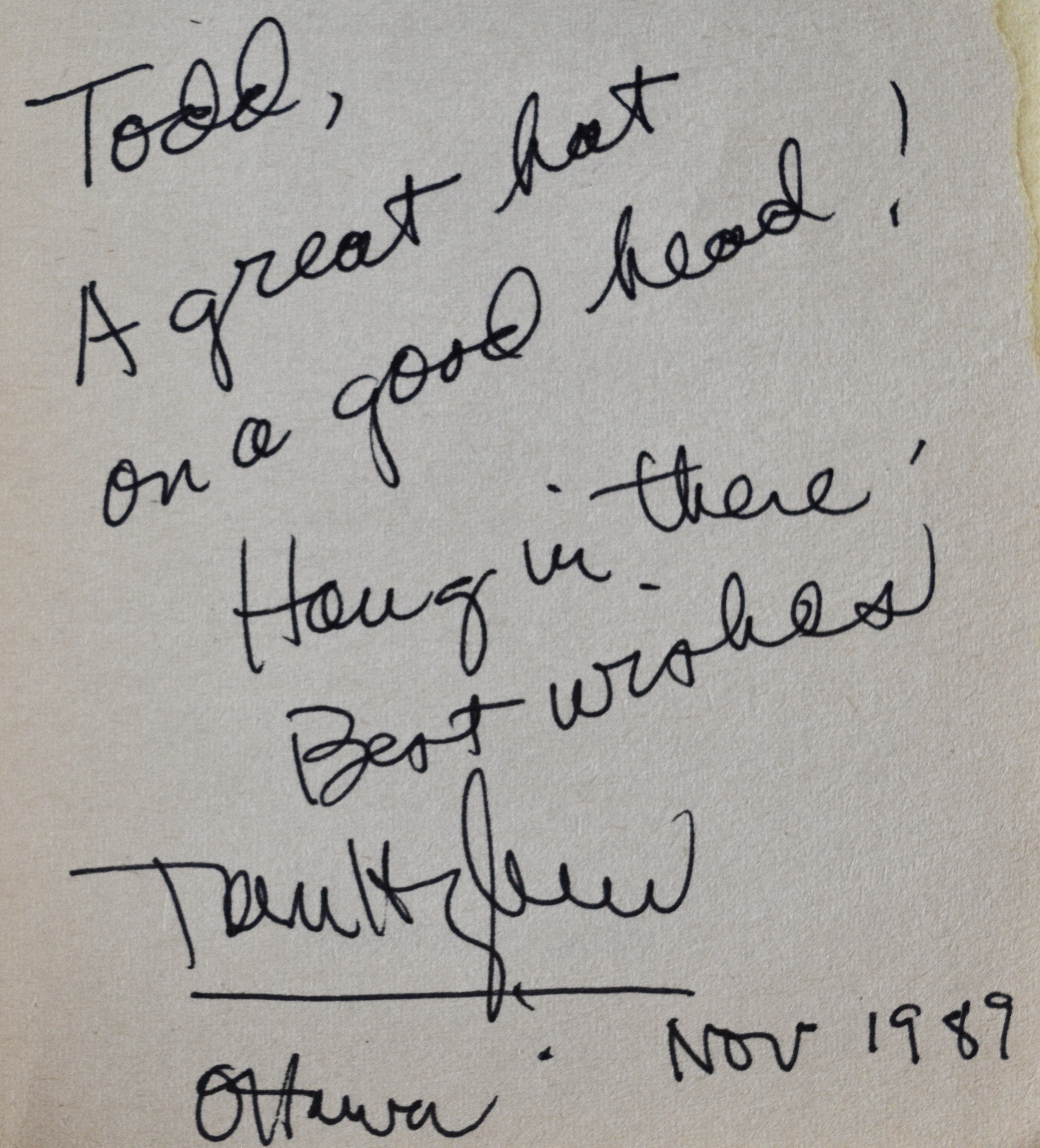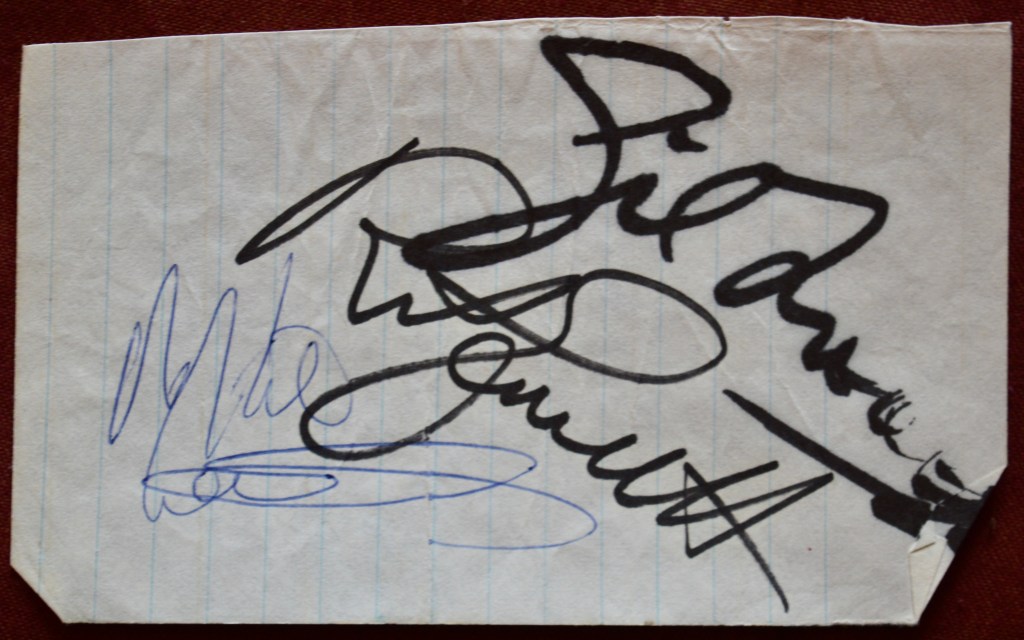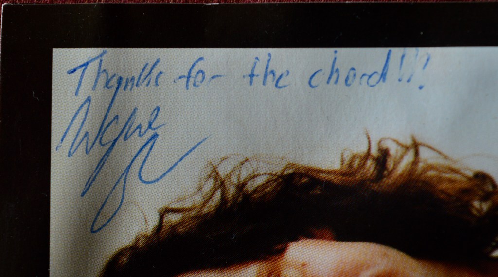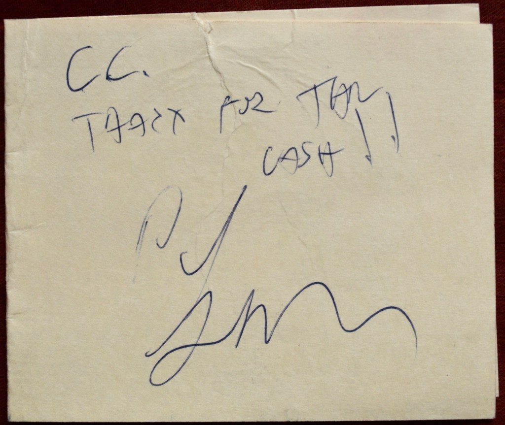 I snagged this signature the first time I visited New York City when I was seated in the front row at a taping of the old David Letterman show on NBC. After the taping Paul Shaffer surprised me by coming up and personally thanking me for wearing the Paul Shaffer and the World’s Most Dangerous Band t-shirt that I had picked up in the gift shop before the show. He seemed genuinely appreciative and after signing the back of this Hard Rock Cafe menu that I had in my pocket he refused to sign anything for anyone else. The whole trip was quite an adventure and you can read about it here. (In my university days my friends called me “CC”, which is why this isn’t addressed to “Todd”.)