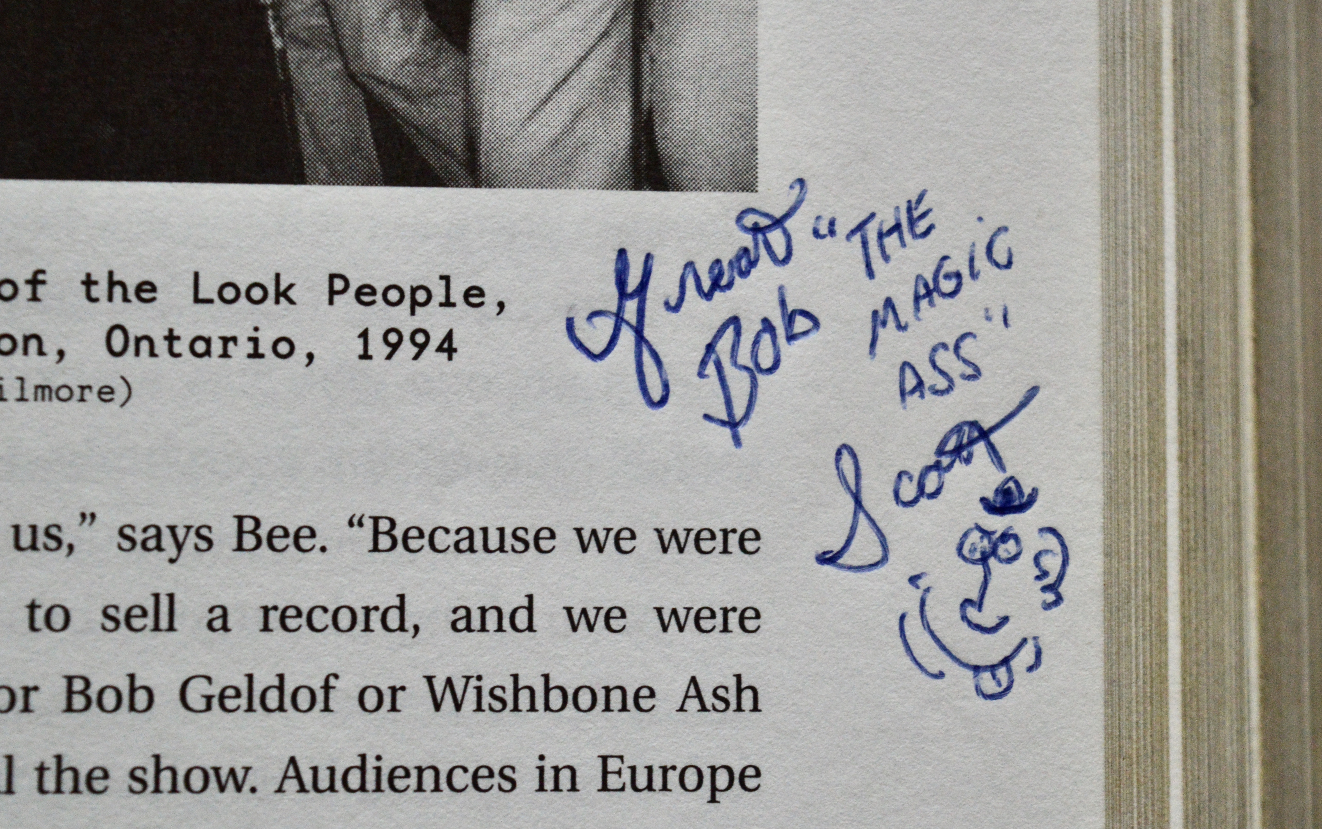 Anyway, I had invited Bob Wiseman to a nero show at The Rivoli in Toronto (Wiseman played on nero’s third album) where he introduced me to “Great” Bob, who happened to be having a drink at the bar. Look People were mentioned a few times in Have Not Been the Same so I ran out to the bus and grabbed it (I’m astounded that I didn’t get Bob Wiseman to sign the book at the same time…I really should look through it again). The “Magic Ass” comment refers to me talking to Bob about the time I saw Look People play at Zaphod’s in Ottawa on September 17th, 1993, when singer Jaymz Bee pulled a guy out of the crowd who just happened to be on the dancefloor holding two ice cream cones, one chocolate and one vanilla. Now, Look People were a weird band, man. Like, over-the-top. “Great” Bob Scott always appeared onstage dressed in a Clockwork Orange costume and he would often get up from his drum kit and run around the stage midsong, keeping the beat by hitting random things with his drumsticks. Anyway, at one point during the Zaphod’s show Jaymz pulls the plant with the ice cream up onto stage and Bob comes to the front and…okay, you’re not going to believe this, but Bob pulled his pants down and bent over gripping his ankles while the guy meticulously shoved both ice cream cones up “Great” Bob Scott’s butt! Like, on stage, in a bar, in front of a hundred people! It was one of the weirdest things I saw at the entire show.