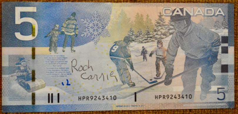 I worked with Canadian author Roch Carrier a few times when he guest-hosted shows I was involved with at the National Arts Centre. Of course Carrier is most famous for his short story The Hockey Sweater, which was immortalized in an NFB animated film that every Canadian becomes endeared with somewhere along the way. Several lines from The Hockey Sweater were included on the reverse of Canada’s 2002 Journey Series five dollar bill, which is quite an honour, really. One of the shows he did with the NAC orchestra was a reading of The Hockey Sweater and Mr. Carrier was gracious enough to sign the fiver pictured above after one of those rehearsals. I was too shy to ask him to Spock Wilf on the other side.