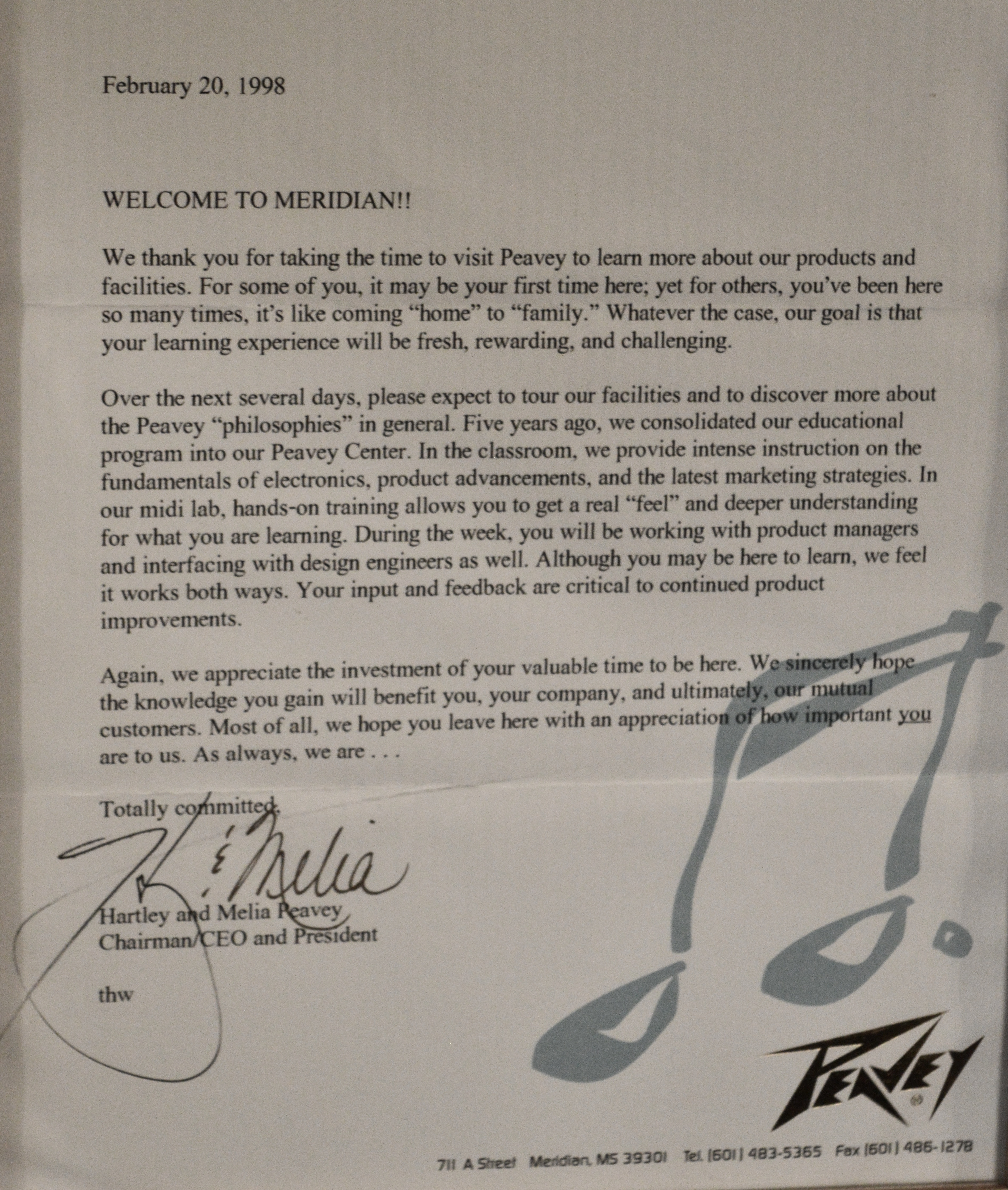 In February 1998 I was privileged to attend Peavey’s Dealer Training Program, a week-long musical equipment indoctrination at Peavey Headquarters in Meridian, Mississippi, where I briefly met Hartley Peavey (owner and sole proprietor of the world’s largest instrument manufacturer) and his wife Melia (1954-1998). They both signed the letter of welcome I received on my first day and the program completion certificate I received on my last. The whole week was a pretty amazing experience, and you can read about it here.