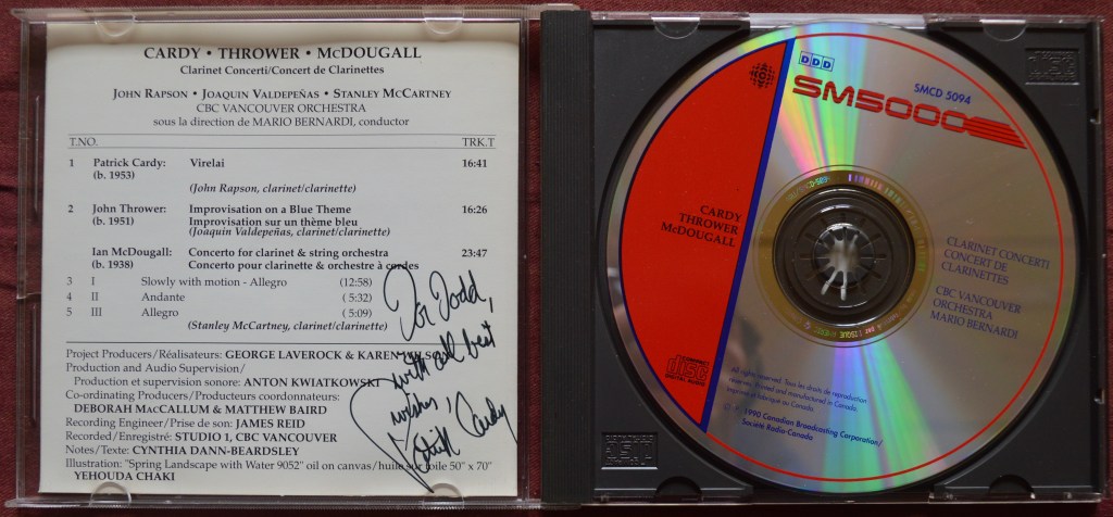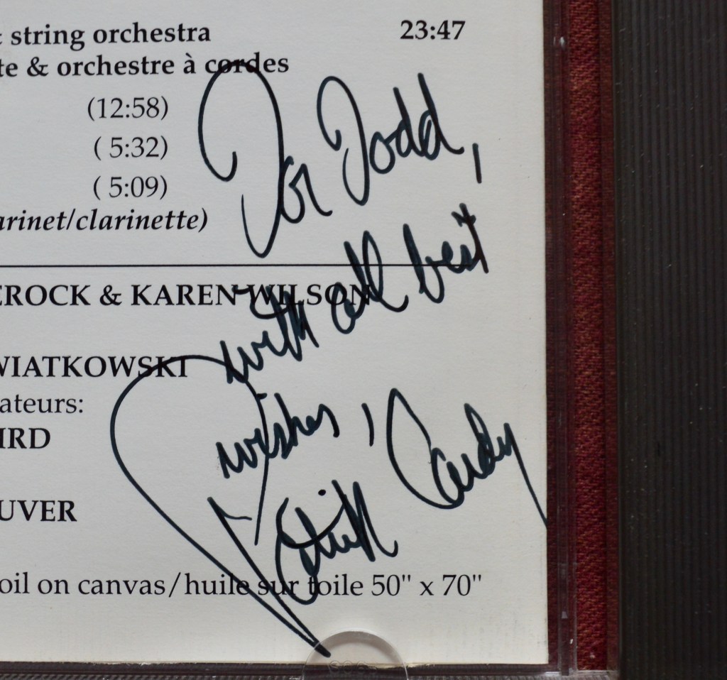 I bought this CD at the premiere of his clarinet concerto Virelai featuring the Ottawa Symphony Orchestra on November 18th, 1994. I got him to sign it after class a few days later, which somehow didn’t improve my theory grade whatsoever.