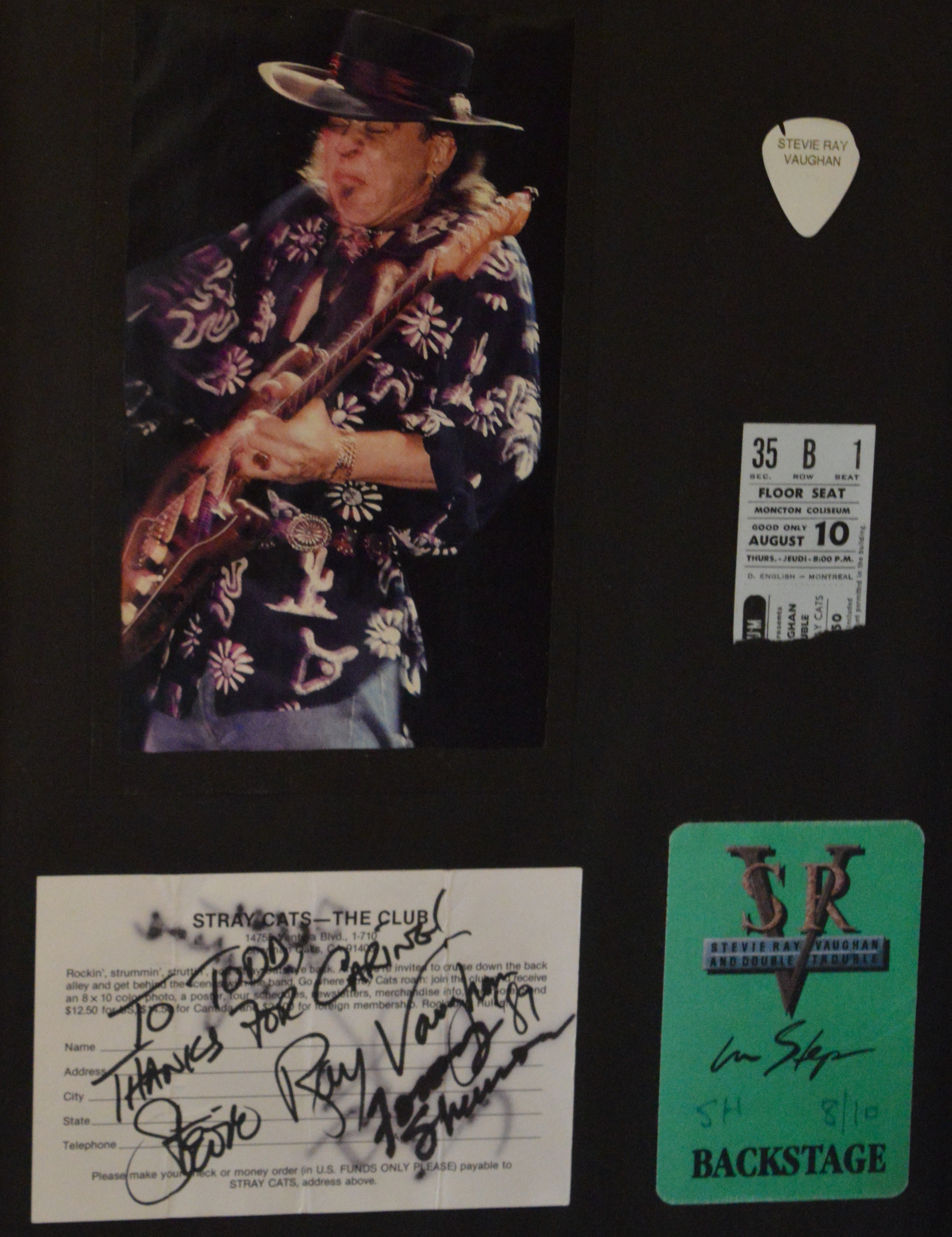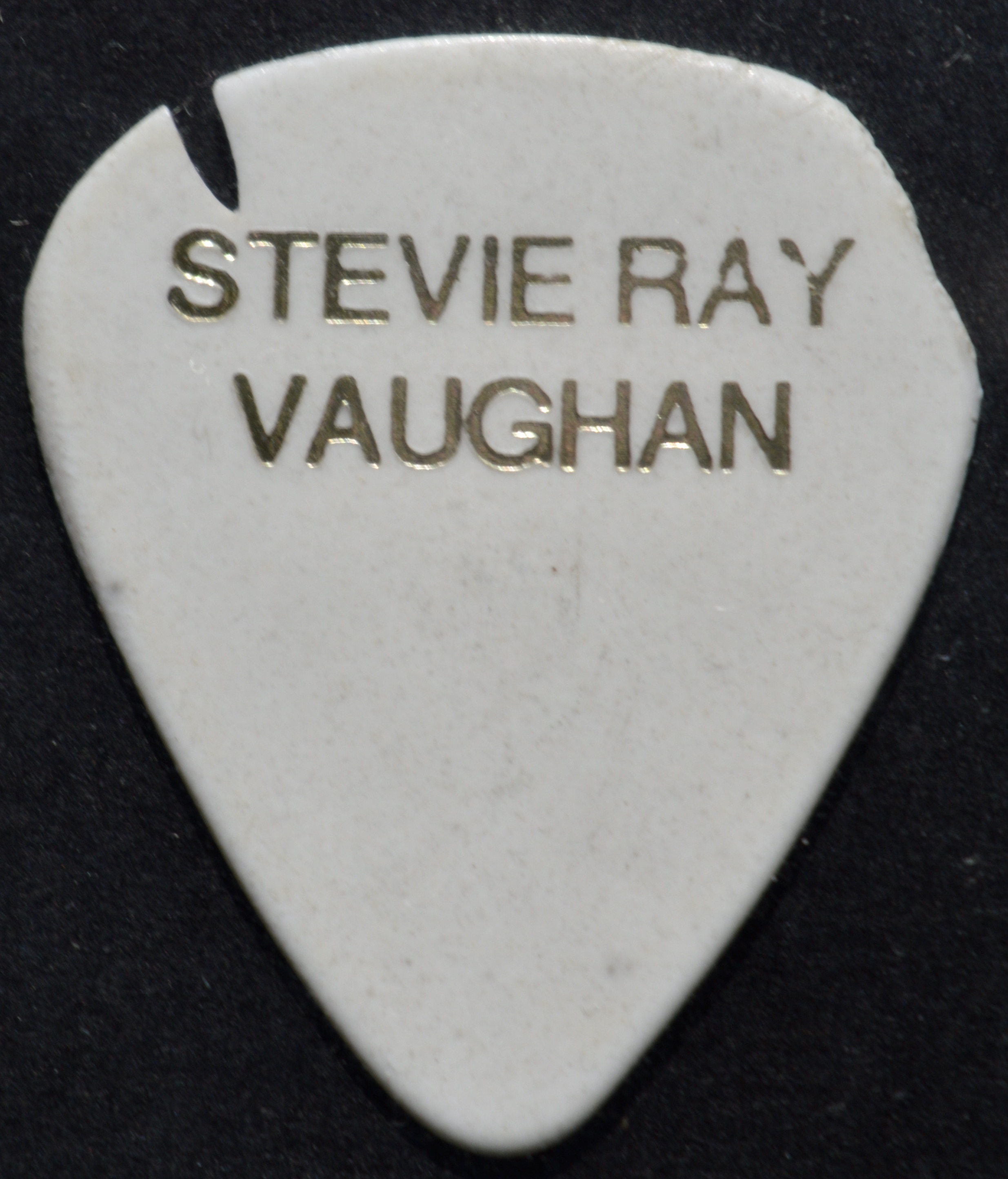 I acquired these items when I met Stevie Ray Vaughan (1954-1990) and Double Trouble (and opening band The Stray Cats) after their concert at the Moncton Coliseum on August 10th, 1989. I was standing front and centre with my chest pressed against the stage when Stevie accidentally dropped his pick. I stretched forward far enough for my feet to leave the floor and just barely managed to reach it. Notice the astounding amount of wear he put into that pick over the course of the concert thus far, already gouging a deep groove on one side and wearing another edge clean off.