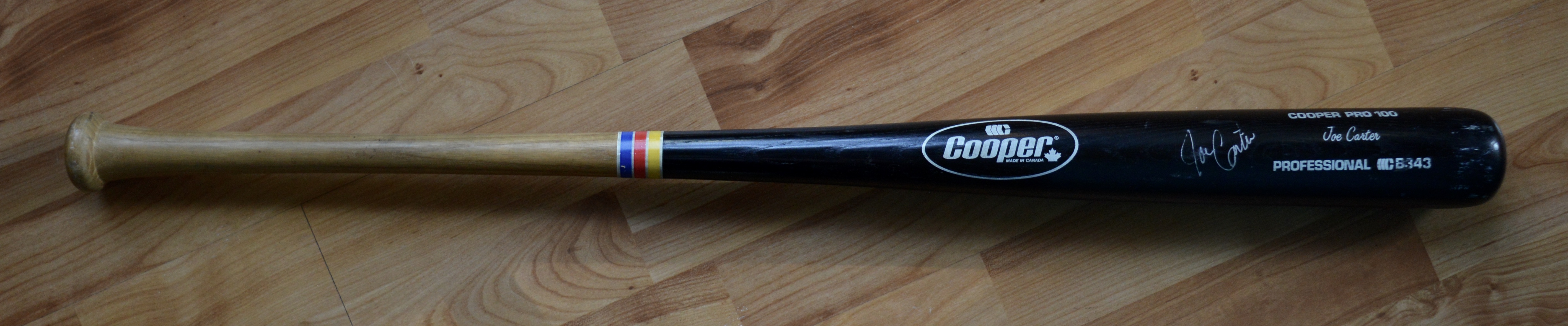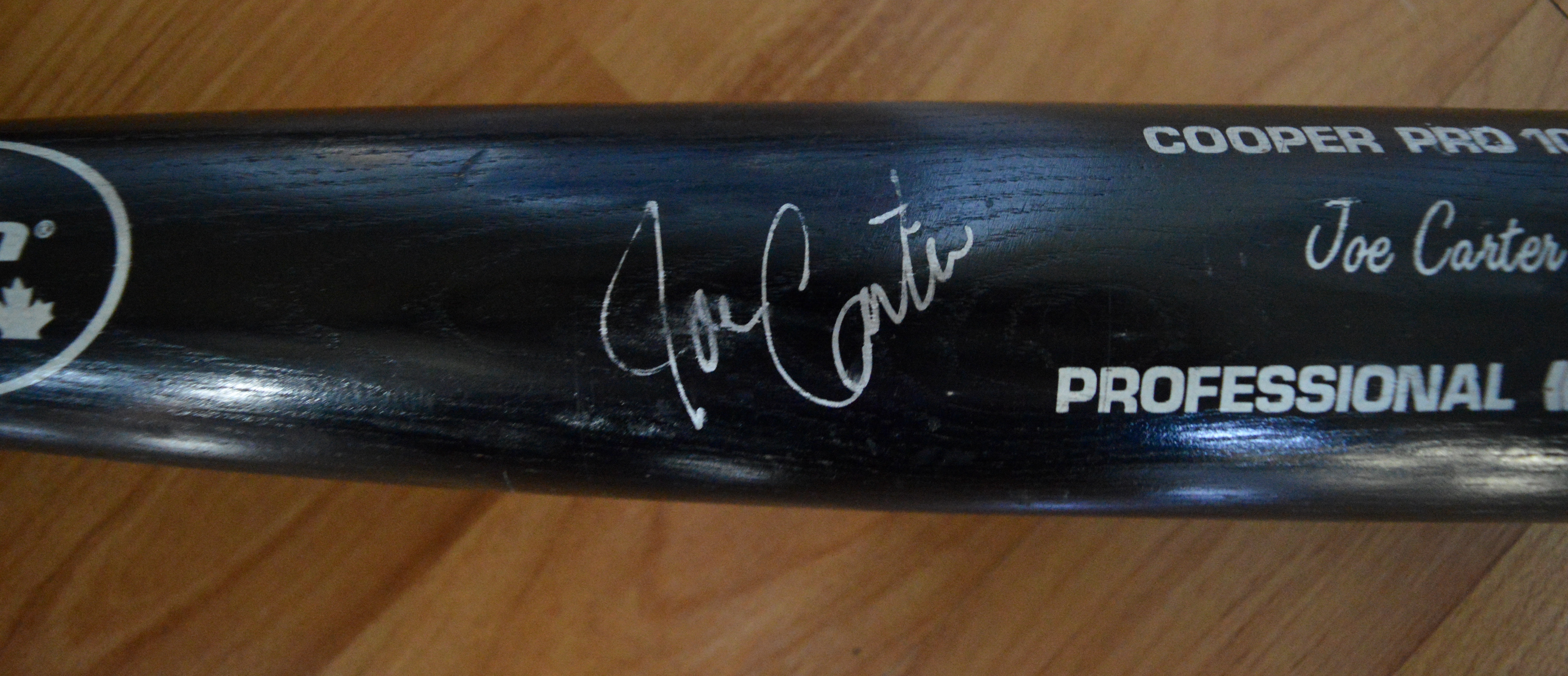 I received this Joe Carter signature bat hand-signed by Joe Carter through a Kraft/Blue Jays promotion around 1992. I also got a ball signed by Dave Winfield and a set of trading cards (now lost) in the same promotion. I’ve never really taken care of the bat; I keep it next to my nightstand for security. Note the dings.
