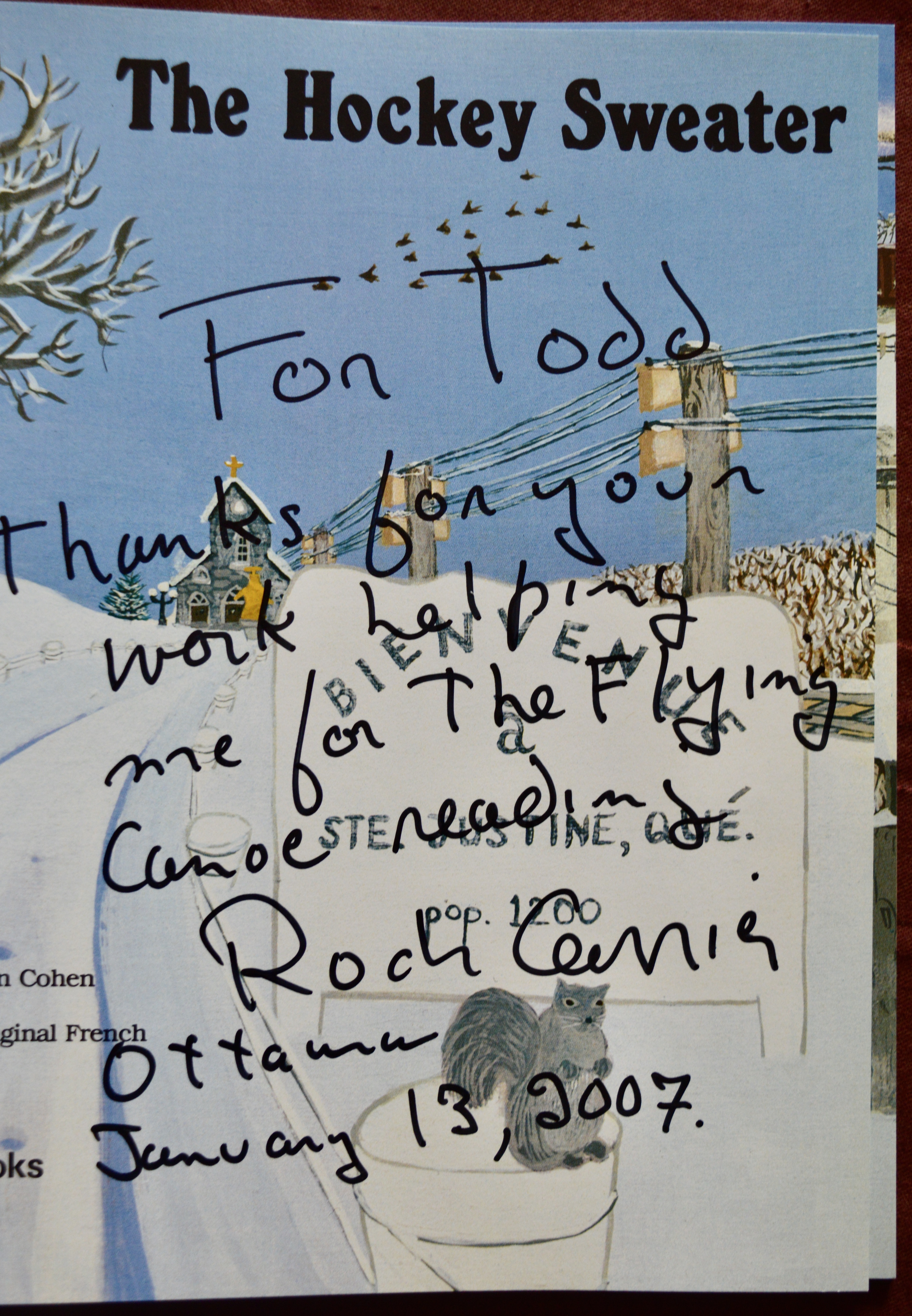 Ironically it was at a completely different show – a musical rendering of Carrier’s story The Flying Canoe – that I asked him to sign an illustrated copy of The Hockey Sweater, pictured below.