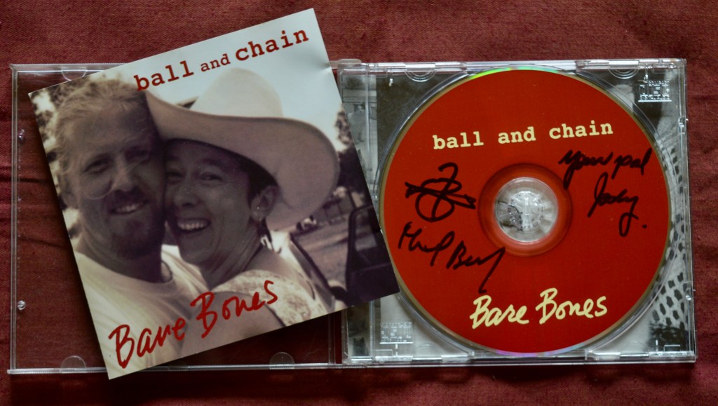 Michael Ball and Jody Benjamin lead an Ottawa-based old-timey country/bluegrass/Cajun outfit called Ball and Chain. Michael and I both taught at the Ottawa Folklore Centre and I used to see them play live all the time. I always really dug the band and I always really dug the band’s name. Above is my signed copy of their 2001 release Bare Bones.