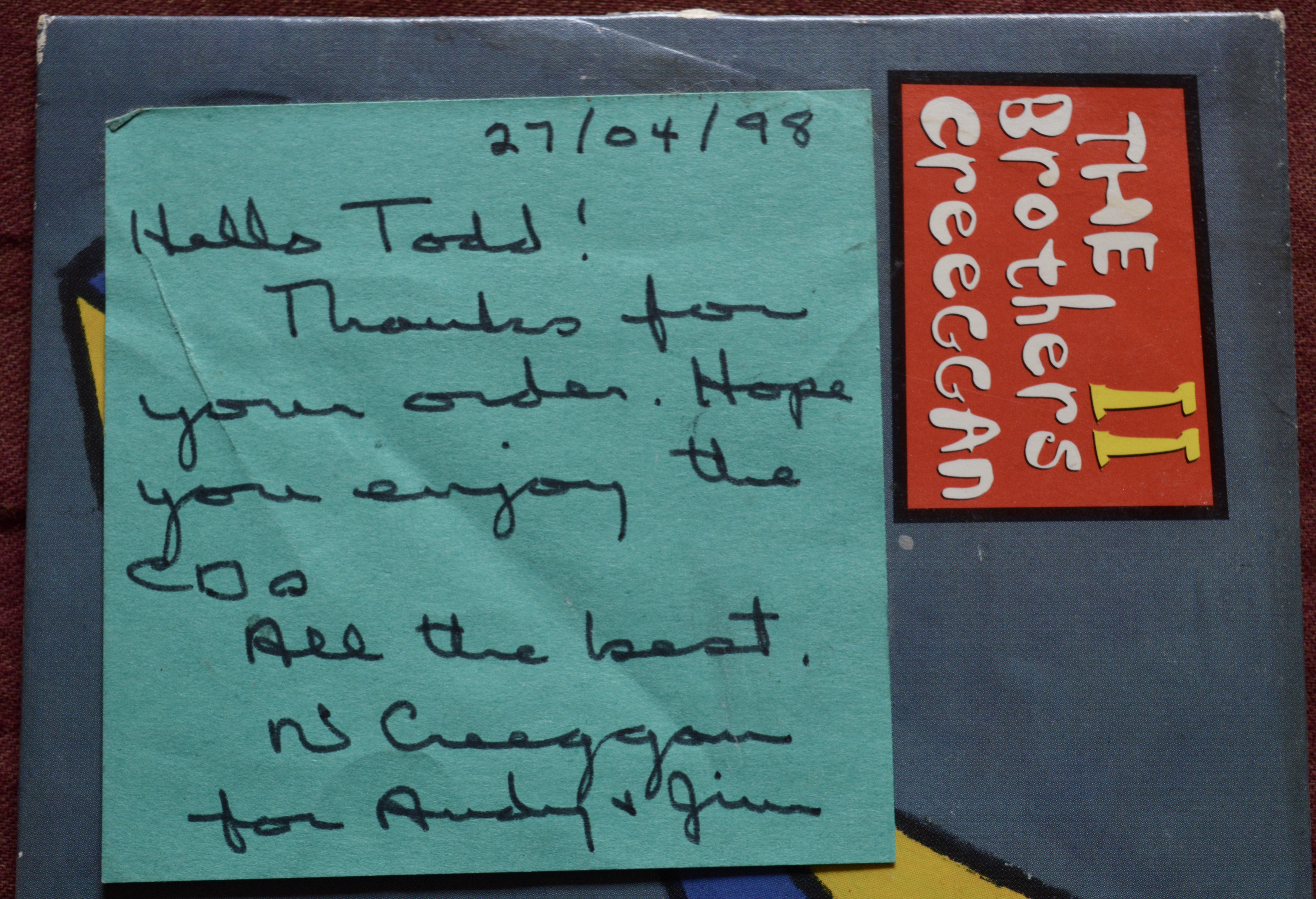 The Creeggan brothers are most famous for playing with Barenaked Ladies (keyboardist Andy left the band after the first two albums while his brother Jim is and has always been their bass player) but the pair has also released four CDs as a duo. I own two of them, and they are both great. I had the CD on the left signed at their Ottawa show at Zaphod’s II on October 16th, 1999 and while the CD on the right hardly counts as memorabilia I find this too endearing not to include: When I ordered a copy of their second recording it arrived in the mail along with a hand-written thank-you note signed by N. Creeggan, who I’m guessing is Jim and Andy’s very supportive mother. Awwww…