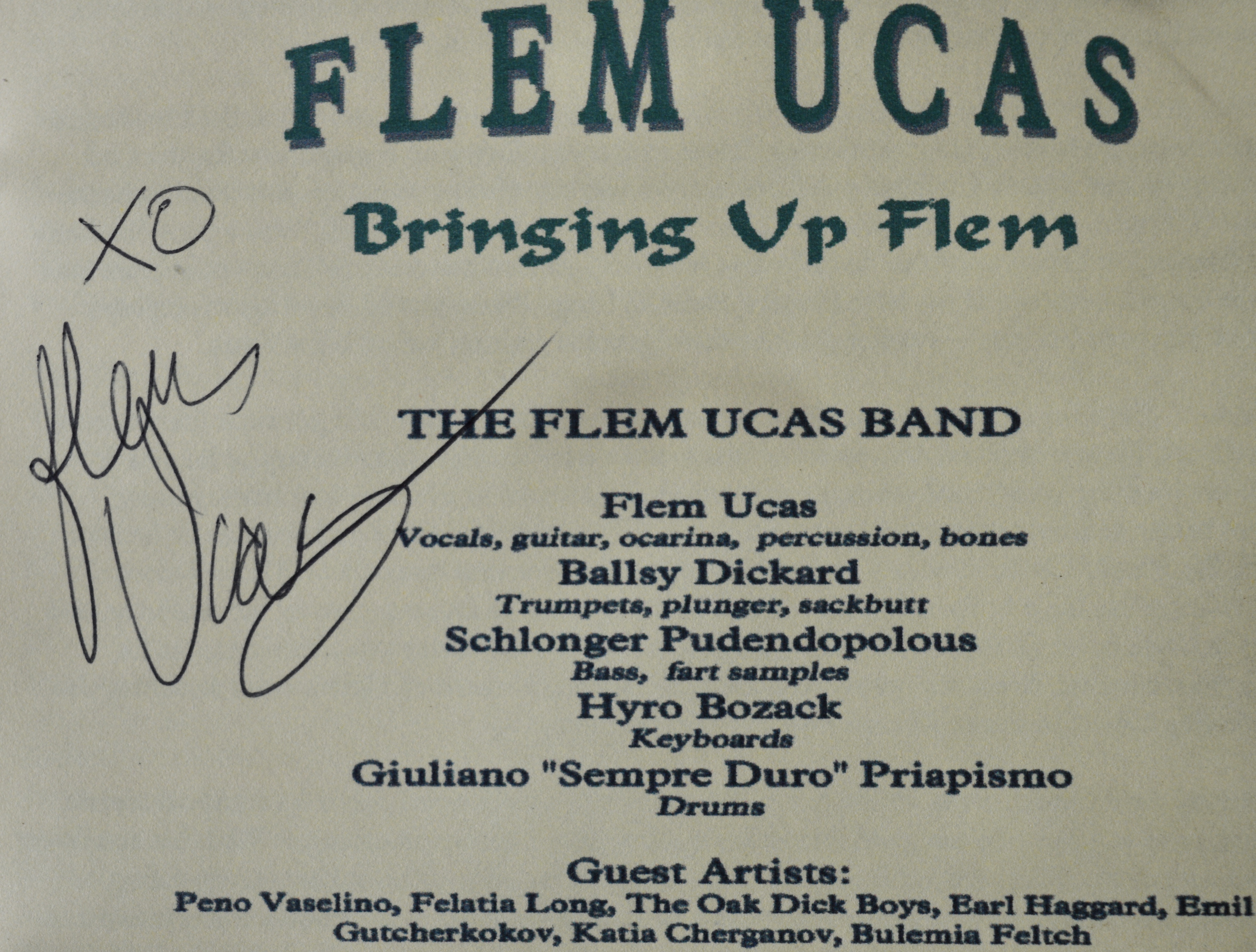 I hope I’m not stealing his thunder when I tell you that Flem Ucas is a nom de plume for musical mad scientist Kurt Walther. Kurt is one of those babbling, bumbling geniuses one tends to meet when they hang out on the odder side of life like, for example, the teaching studios of the Ottawa Folklore Centre, where Kurt and I both taught for years and years and years. Bringing Up Flem is a bizarre album and one of many Kurt has released or been a part of (I have another of his called Still Life with Frogs that is quite brilliant) and I’m glad I had the guts to ask him to sign it for me.
