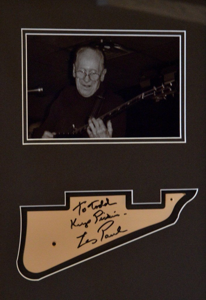 On Valentine’s Day 2005 myself and three friends embarked on a 26-hour in-and-out mission to NYC to see the legendary Les Paul (1915-2009) play at the Iridium nightclub. It numbs me to think that I talked my way backstage after the show and found myself sitting on a couch having a one-on-one with the man who invented the electric guitar (and reverb, and multi-track recording), which is where I had him sign this pickguard from a Gibson Les Paul. You can read about the whole adventure here.
