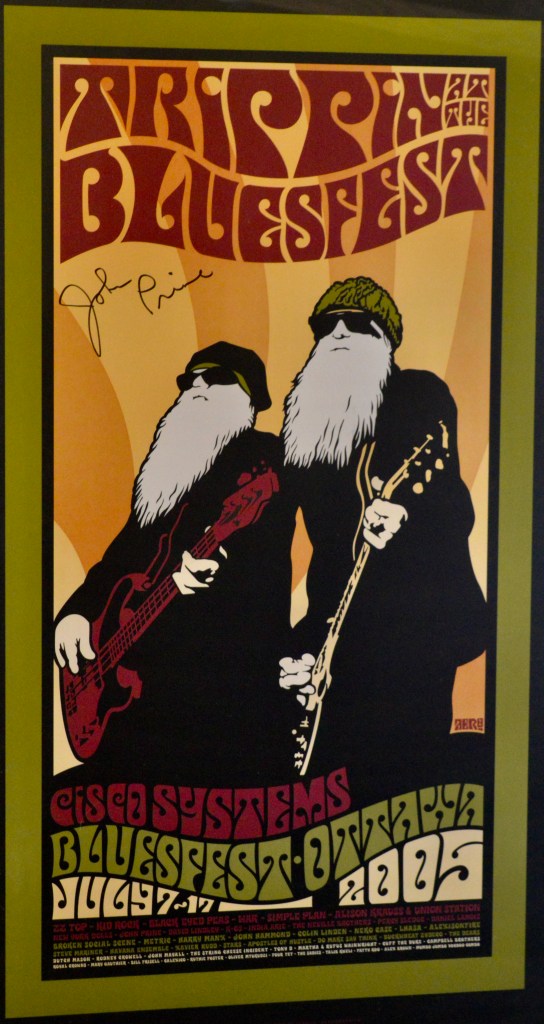 It may seem strange to have John Prine’s (1946-2020) autograph on a poster featuring ZZ Top but Prine did play at the Ottawa Bluesfest that year. As a matter of fact he closed out the entire festival on July 17th, 2005 and he was fantastic. I bought this poster from the Bluesfest’s charity poster sale as a gift for m’lady’s birthday.