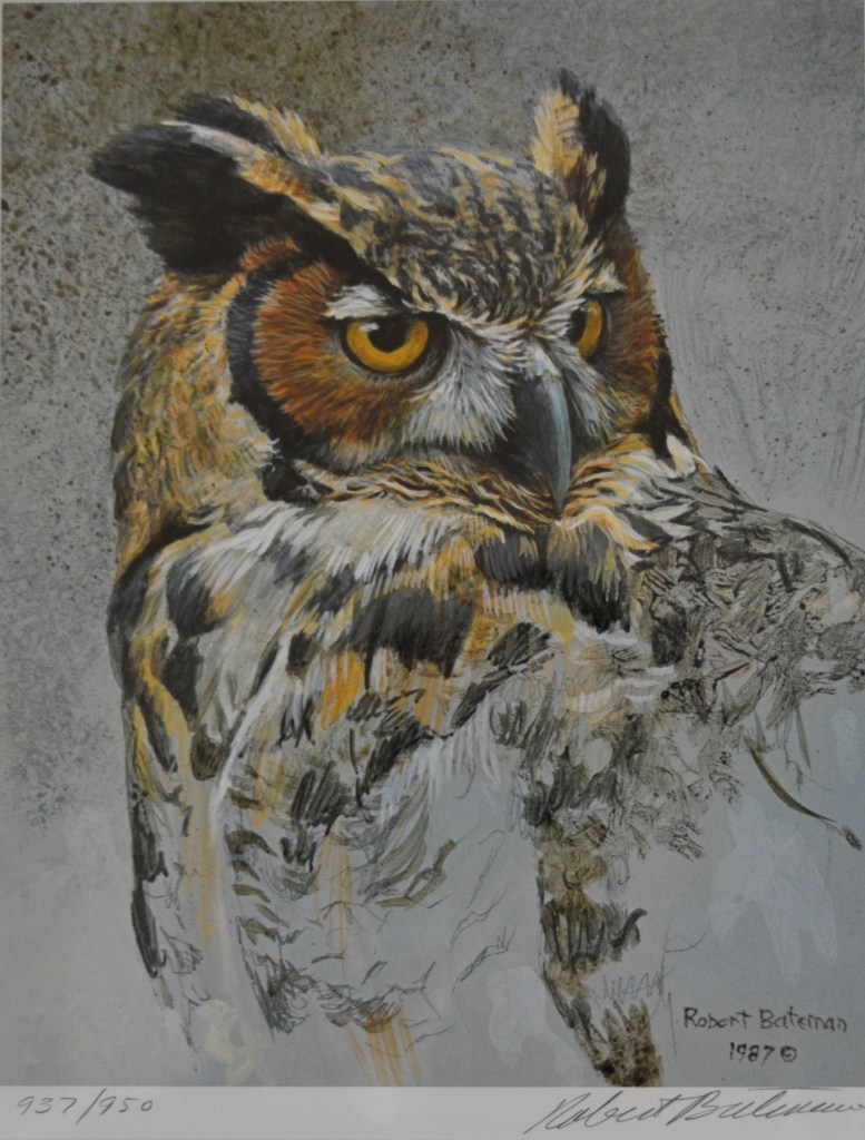 I was pretty impressed with myself when I bought this signed and numbered print of Robert Bateman’s Great Horned Owl Study as a Christmas present for my parents back in the early ’90’s. It was quite a strain for a poor student like me but they were hard to buy for and I thought it was a rather classy gift. I’m not sure they ever really liked it though, and when my mom downsized to a smaller home she was pretty quick to give it up when I asked her about it.