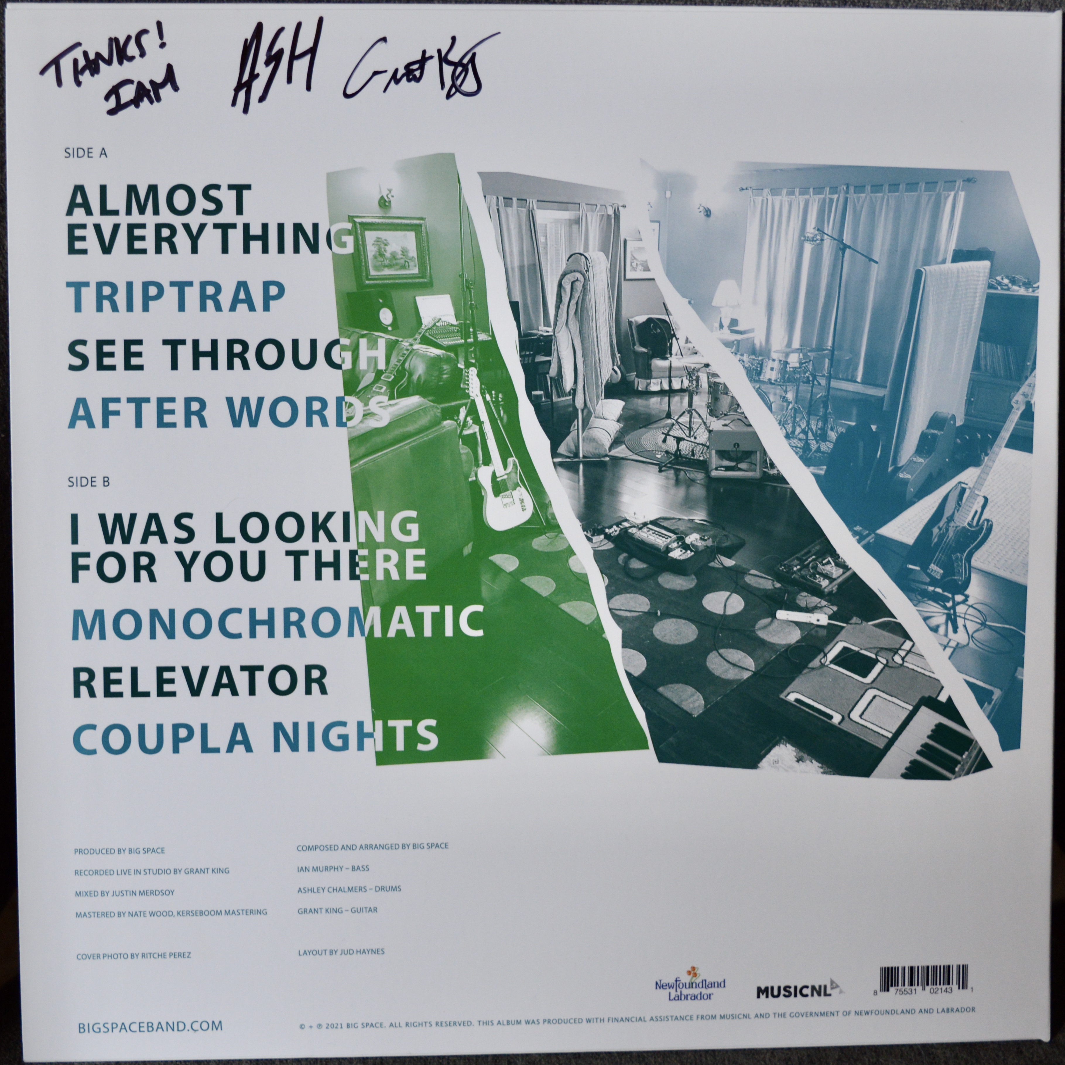 Big Space is a fantastic instrumental jazz/rock/but mostly jazz trio based in St. John’s, Newfoundland. Pictured above is what I believe to be the first-ever copy of their debut album that was signed by all three members. I brought my own Sharpie™ to their sparsely attended album release show and had them sign it at setbreak. Clearly not yet at the top of their record-signing game, they did their best not to mar the cover, with each of them putting small, incognious signatures on the back that ironically take up as little space as possible.