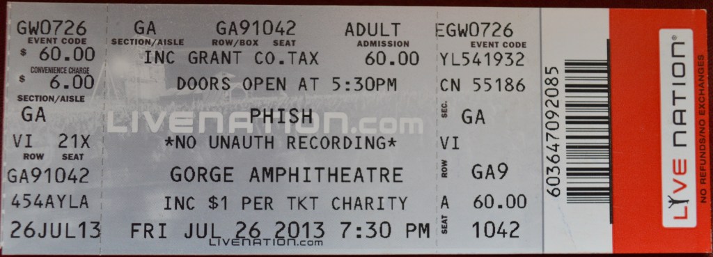 When m’lady and I were planning our entire-west-coast Phish+ tour she pulled a Phish-ninja move and suggested that we order tickets for every show except the two night stint at The Gorge. She had been to The Gorge many times – in fact it was m’lady’s favourite outdoor venue (“Have you been to Red Rocks?!?” I asked her…she just nodded solemnly) – and she said there were always a million extra tickets floating around. If we didn’t score tickets for free in the lot surely we’d get them for ten bucks a night; twenty tops.